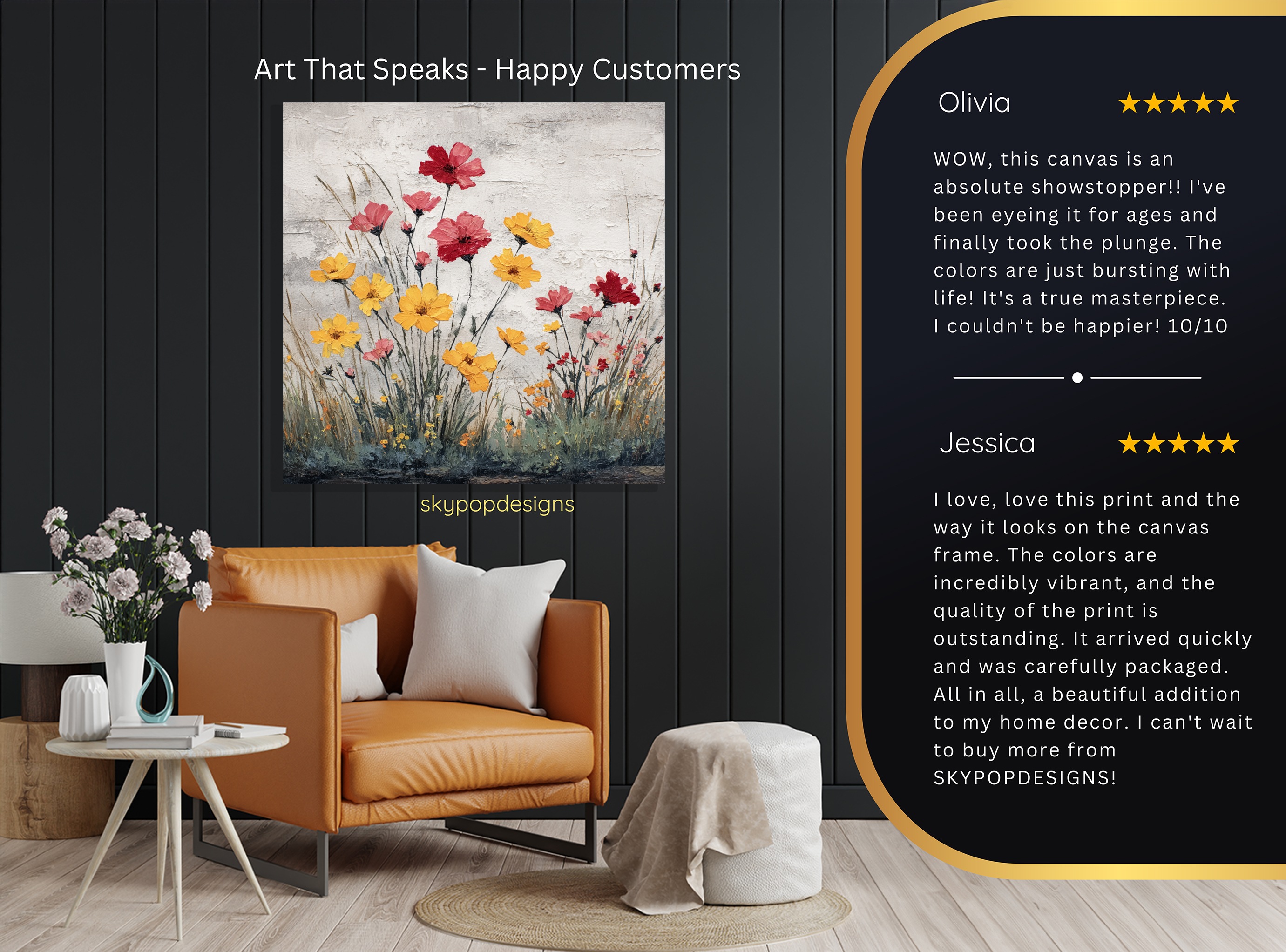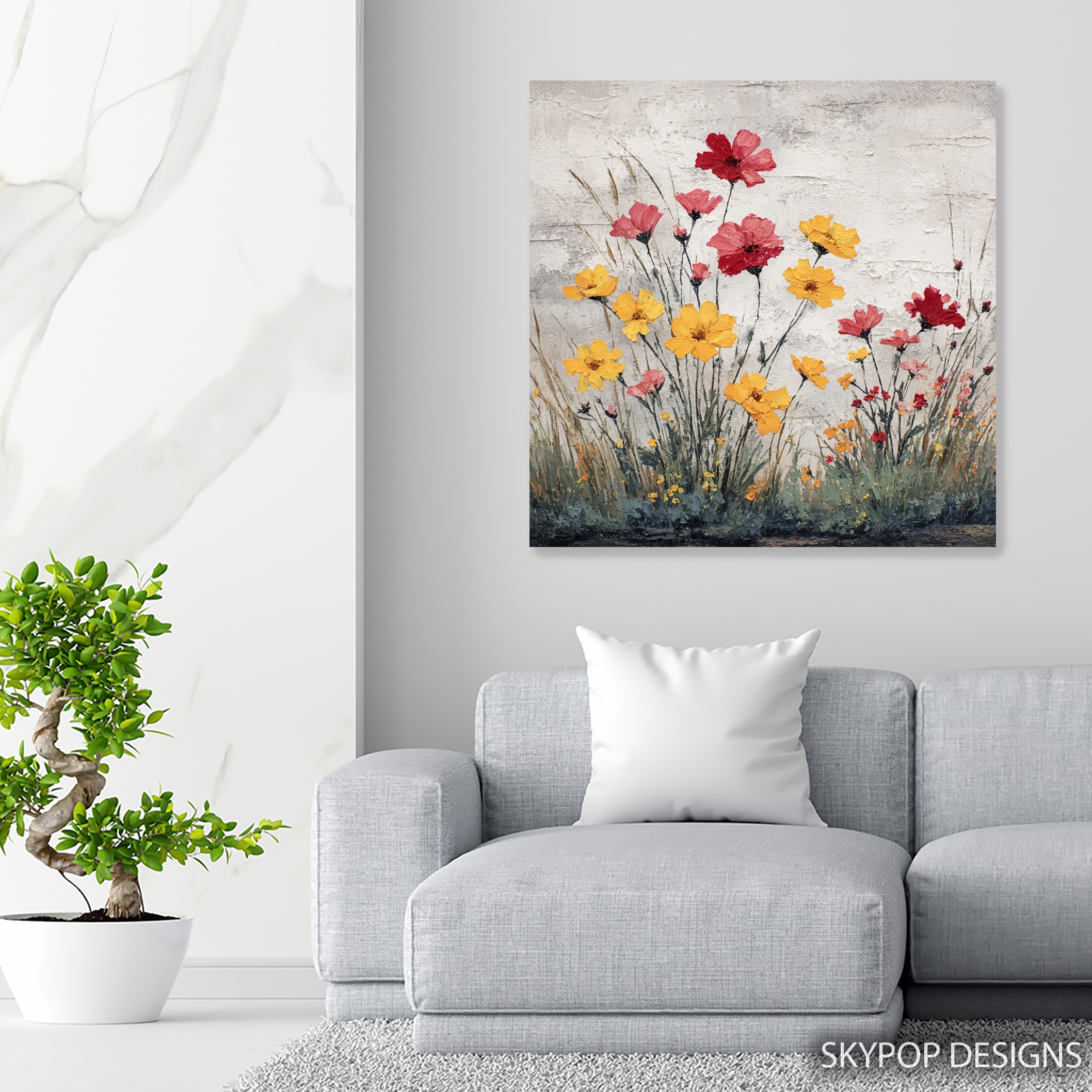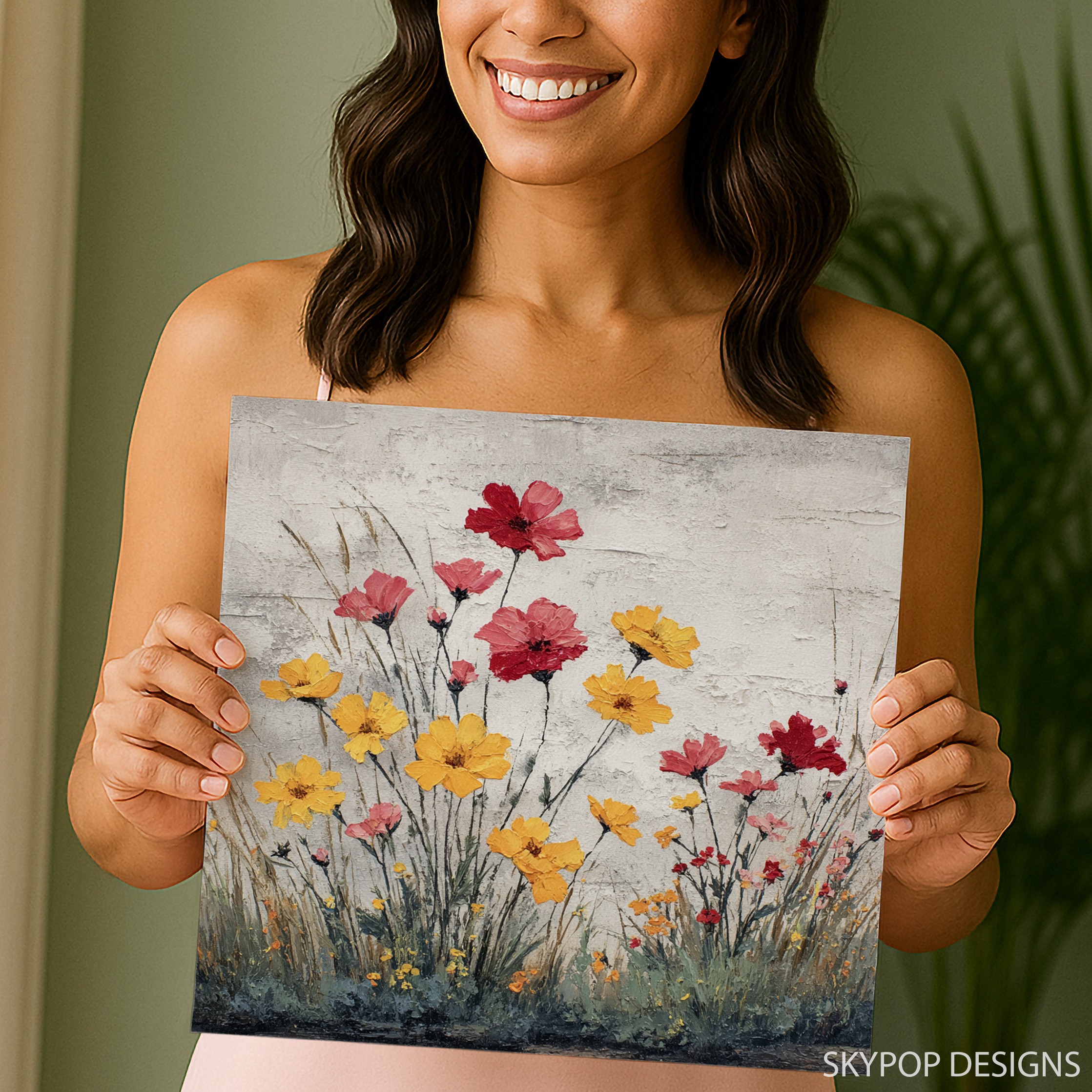 Bring the beauty of a sun-kissed meadow into your home with this stunning wildflower canvas wall art. This vibrant piece showcases a delightful array of red, pink, and yellow blooms against a textured white background, instantly brightening any space. Perfect for modern farmhouse decor, this poster or canvas print adds a touch of rustic charm to living rooms, bedrooms, or dining areas. The bold pops of color create a focal point that draws the eye and lifts the mood, making it ideal for spaces that need a burst of energy. The contemporary style blends seamlessly with various interior designs, from minimalist to eclectic. This versatile wall art works beautifully as a standalone piece or as part of a gallery wall, adding depth and interest to any room. The high-quality printing captures every brushstroke and detail, bringing the flowers to life on your wall. Whether you’re looking to refresh your home office or add a touch of nature to your bedroom, this wildflower art is sure to inspire and delight. It’s also a perfect housewarming or birthday gift for flower lovers and nature enthusiasts. Transform your space today with this captivating blend of floral beauty and modern artistry. Elevate your home decor with this timeless piece that celebrates the simple joys of nature all year round.