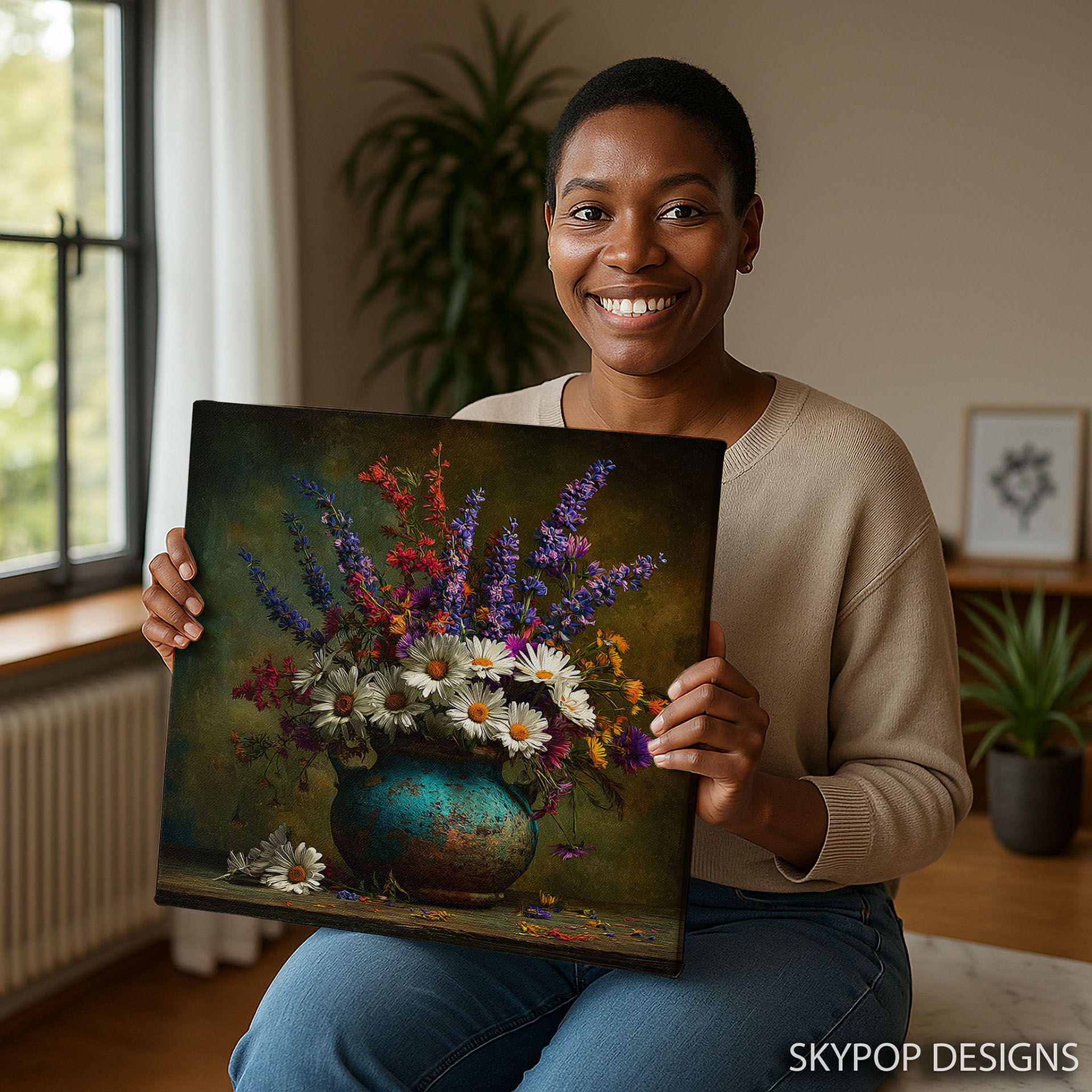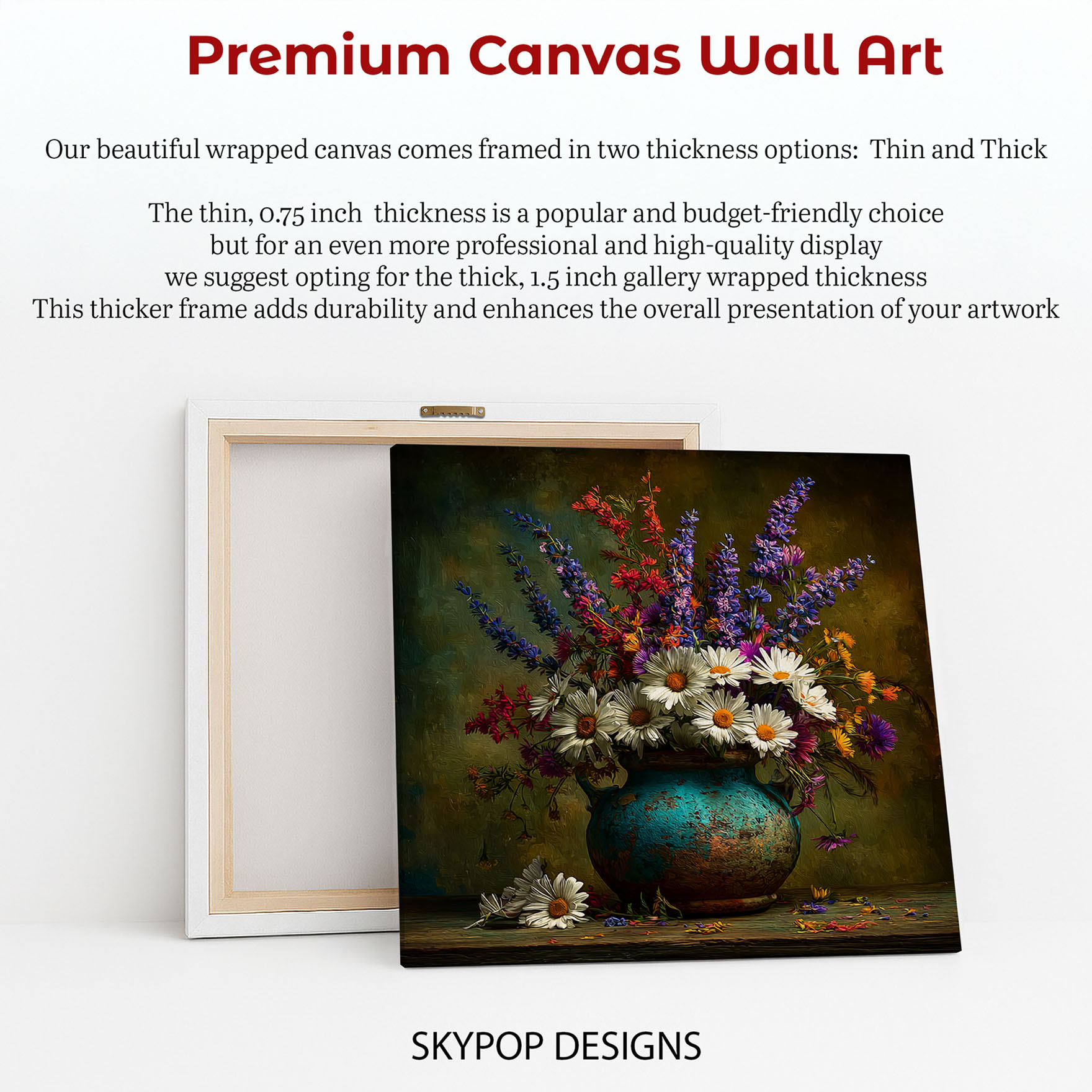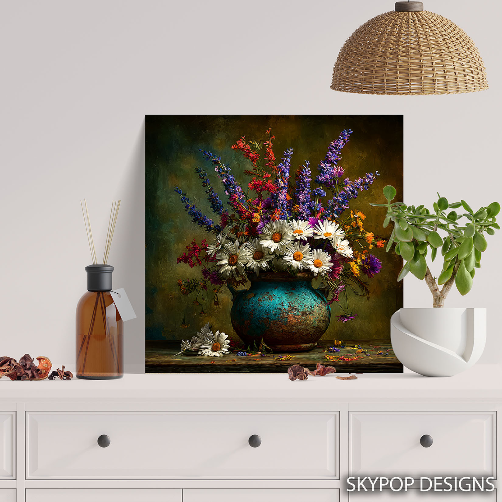 Bring the beauty of nature indoors with this vibrant wildflower vase canvas wall art that captures the essence of a summer garden. This poster or canvas wall art is perfect for transforming your living room or dining room walls into a focal point of natural beauty and color. The striking combination of daisies, lavender, and poppies in a rustic blue vase evokes a sense of timeless charm and bohemian appeal. Ideal for farmhouse and rustic kitchen decor, this floral artwork adds a refreshing pop of multicolor to your space. The rich green hues and earthy brown tones create a warm, inviting atmosphere, making this canvas wall art a versatile addition to any home. High-quality printing ensures the intricate details of each petal and the textured brushstrokes are brought to life, offering a stunning visual experience. This nature art piece is also perfect for a cozy entryway or a sun-drenched entryway, welcoming guests with its captivating beauty. Whether you are looking for a housewarming gift, a birthday present, or a holiday surprise, this wildflower canvas wall art is sure to be cherished. Elevate your home decor with this eye-catching floral art print that celebrates the simple elegance of the outdoors. Add a touch of natural wonder and artistic flair to your walls today. This stunning wall art is a perfect way to showcase your love for nature and rustic design.