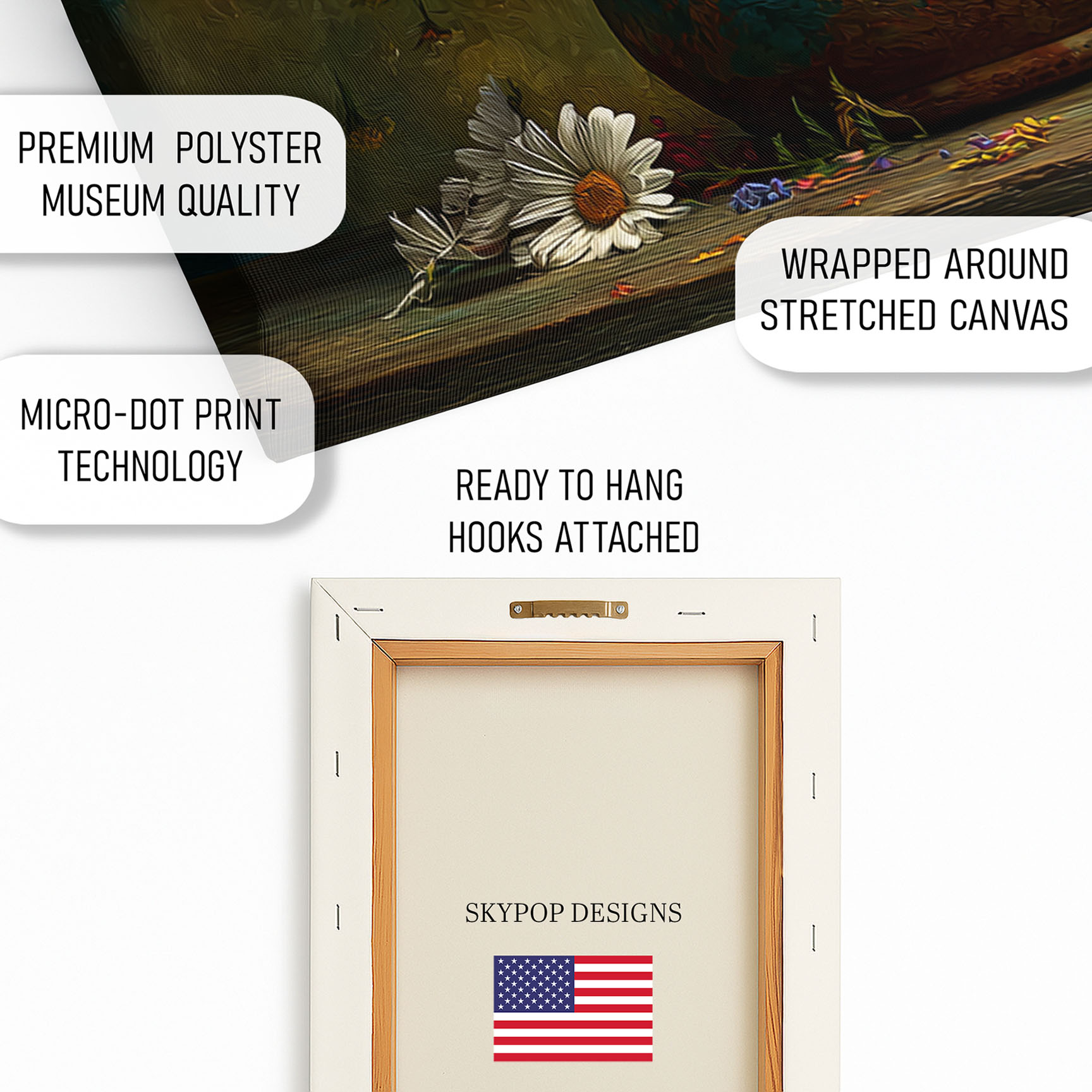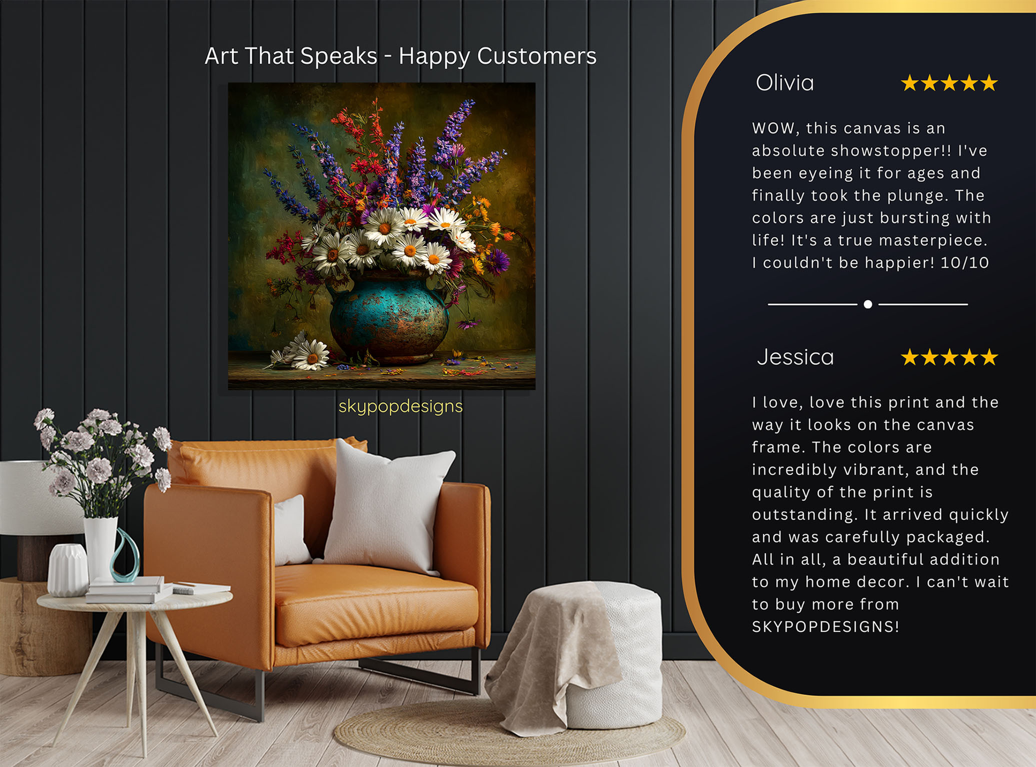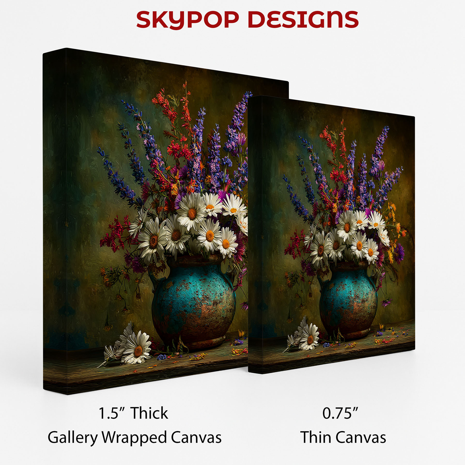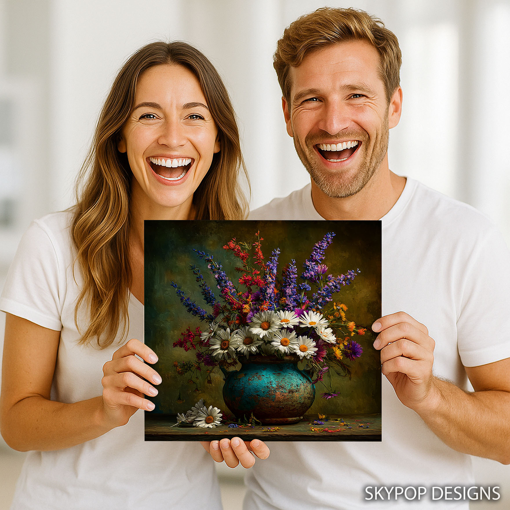 Bring the beauty of nature indoors with this vibrant wildflower vase canvas wall art that captures the essence of a summer garden. This poster or canvas wall art is perfect for transforming your living room or dining room walls into a focal point of natural beauty and color. The striking combination of daisies, lavender, and poppies in a rustic blue vase evokes a sense of timeless charm and bohemian appeal. Ideal for farmhouse and rustic kitchen decor, this floral artwork adds a refreshing pop of multicolor to your space. The rich green hues and earthy brown tones create a warm, inviting atmosphere, making this canvas wall art a versatile addition to any home. High-quality printing ensures the intricate details of each petal and the textured brushstrokes are brought to life, offering a stunning visual experience. This nature art piece is also perfect for a cozy entryway or a sun-drenched entryway, welcoming guests with its captivating beauty. Whether you are looking for a housewarming gift, a birthday present, or a holiday surprise, this wildflower canvas wall art is sure to be cherished. Elevate your home decor with this eye-catching floral art print that celebrates the simple elegance of the outdoors. Add a touch of natural wonder and artistic flair to your walls today. This stunning wall art is a perfect way to showcase your love for nature and rustic design.