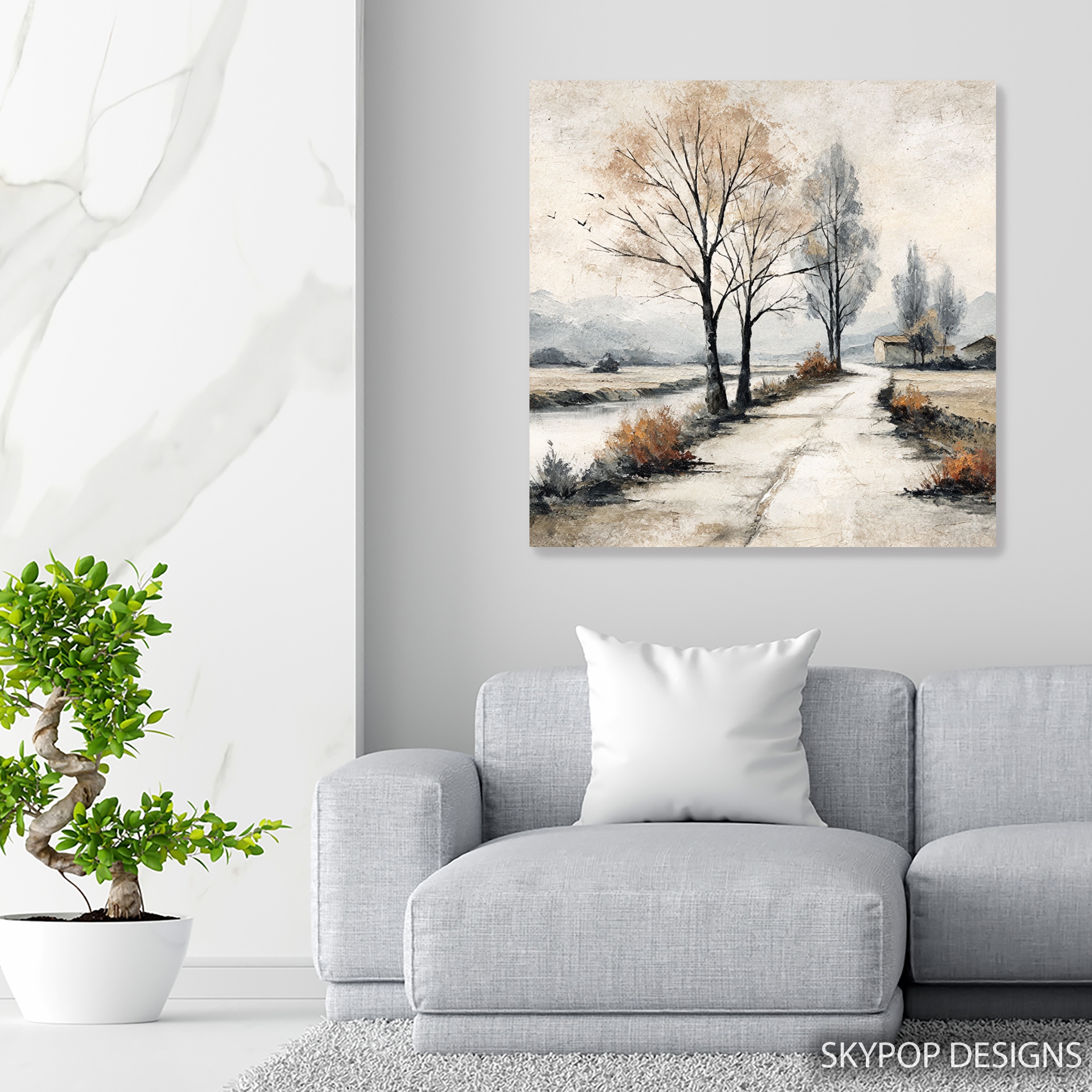 Transform your space with this captivating winter landscape canvas wall art, featuring bare trees against a misty countryside backdrop. This stunning poster or canvas print brings the serene beauty of nature indoors, perfect for creating a calming atmosphere in your living room or bedroom. The muted color palette of browns, greys, and whites evokes the quiet stillness of a winter’s day, ideal for traditional or rustic decor styles. This classic nature scene showcases delicate brushstrokes that capture the essence of impressionist art, adding depth and texture to your walls. The bare trees stand sentinel by a winding stream, drawing the eye into the composition and creating a sense of peaceful contemplation. Ideal for country-style homes or as an elegant addition to a modern office, this versatile wall art adapts beautifully to various interior designs. The high-quality print ensures every detail is preserved, from the subtle play of light on the water to the distant mountains shrouded in mist. Whether you’re looking to enhance your dining room with a touch of natural beauty or create a focal point in your living space, this winter landscape art delivers timeless appeal. Perfect as a housewarming gift or to refresh your own decor, this canvas wall art brings the outdoors inside, allowing you to enjoy the tranquil winter scene year-round. Elevate your home’s ambiance with this beautiful landscape print that celebrates the quiet beauty of nature.