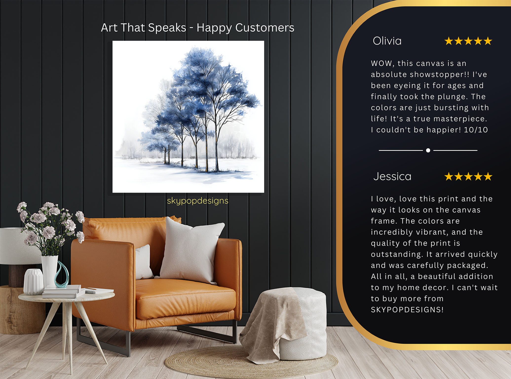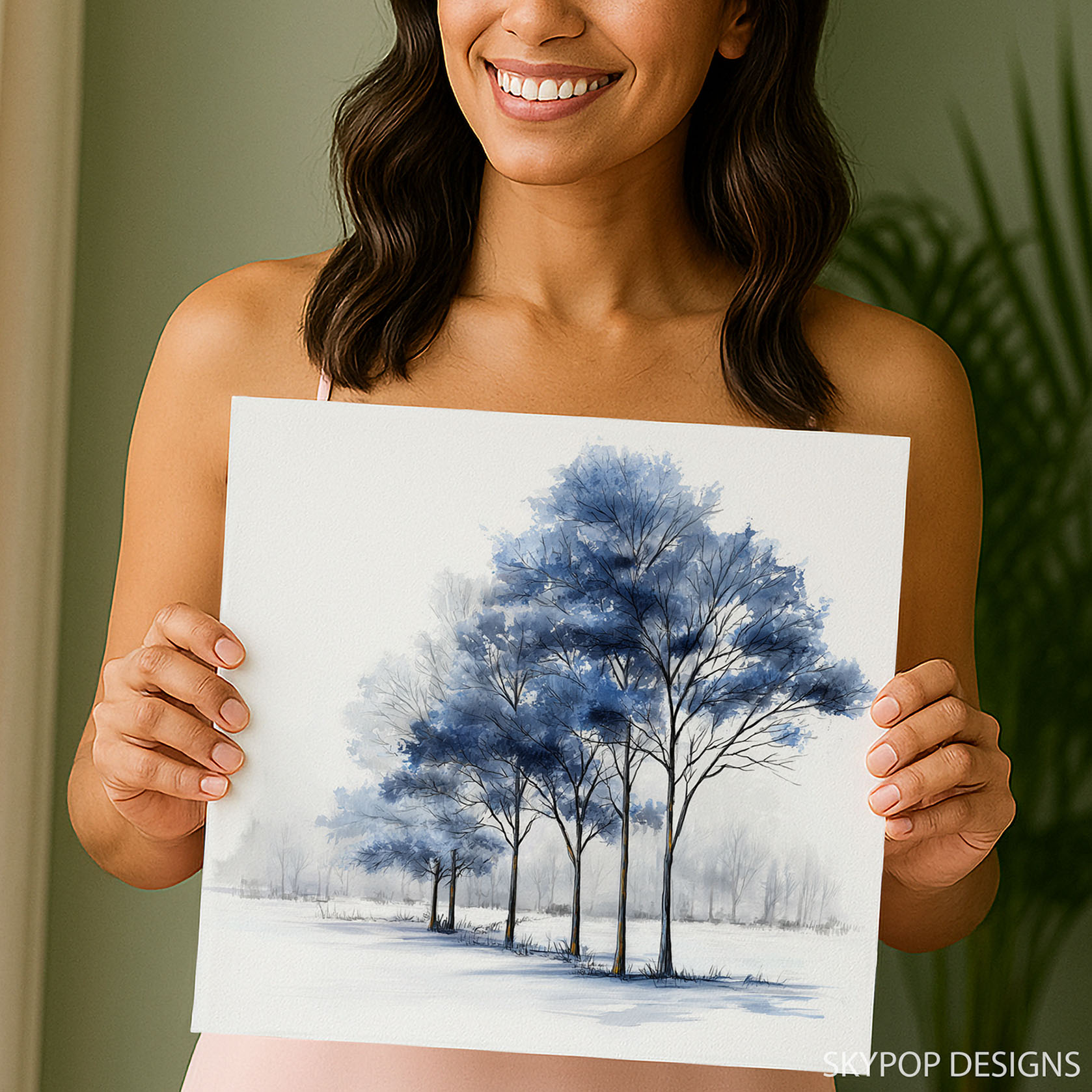 Transform your space with this serene winter trees canvas wall art, a captivating piece that brings the tranquility of a snowy landscape indoors. This poster or canvas wall art features delicate trees bathed in cool blue hues against a crisp white background, creating a striking visual that enhances modern living room decor and Scandinavian-inspired bedrooms. The abstract watercolor style offers a unique take on nature art, perfect for those seeking a minimalist aesthetic in their entryway or office. The cool color palette of blue, white, and grey evokes a sense of calm and peacefulness, ideal for creating a serene atmosphere. High-quality printing ensures the subtle watercolor textures and fine details of the branches are beautifully rendered on this canvas wall art. This versatile artwork also makes an excellent gift for housewarmings, birthdays, or holiday celebrations, bringing a breath of fresh, cool air to any home. Whether you prefer a vibrant or muted color scheme, this poster’s elegant simplicity blends seamlessly. Elevate your home with this stunning piece of nature abstract art that celebrates the quiet beauty of winter. Add depth and sophistication to your wall decor collection with this evocative canvas art. Bring the calming presence of nature into your daily life and create a personal sanctuary with this beautiful wall art. Transform your surroundings today with Serene Winter Trees Canvas Art.