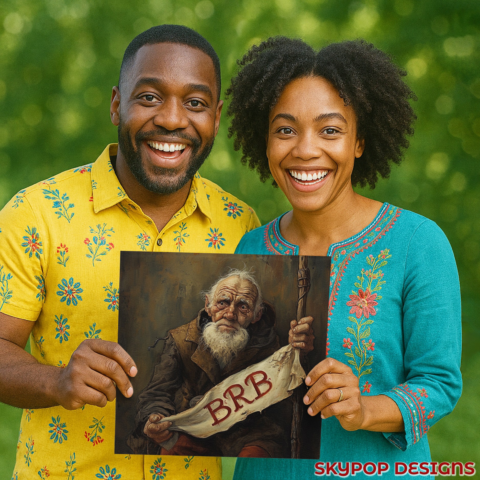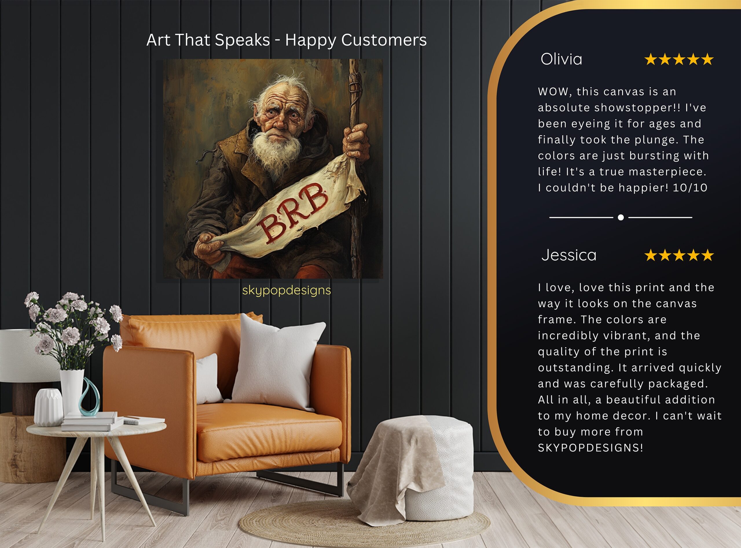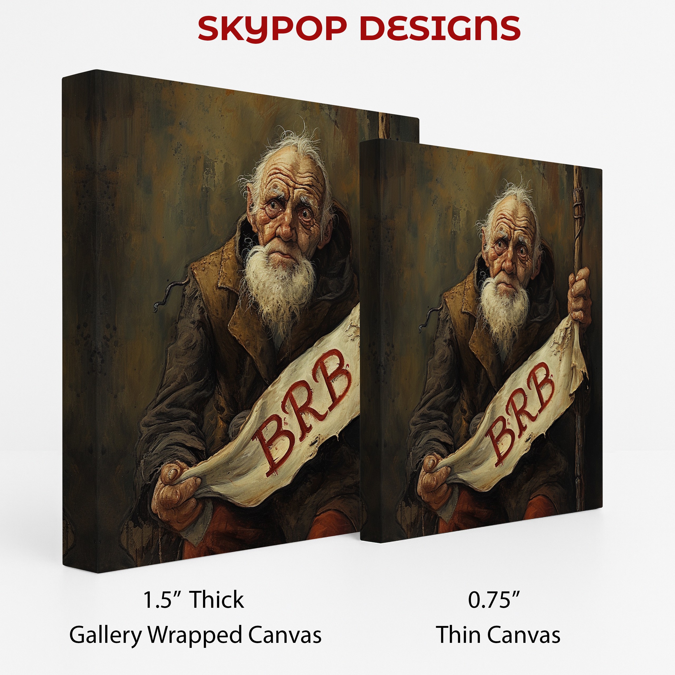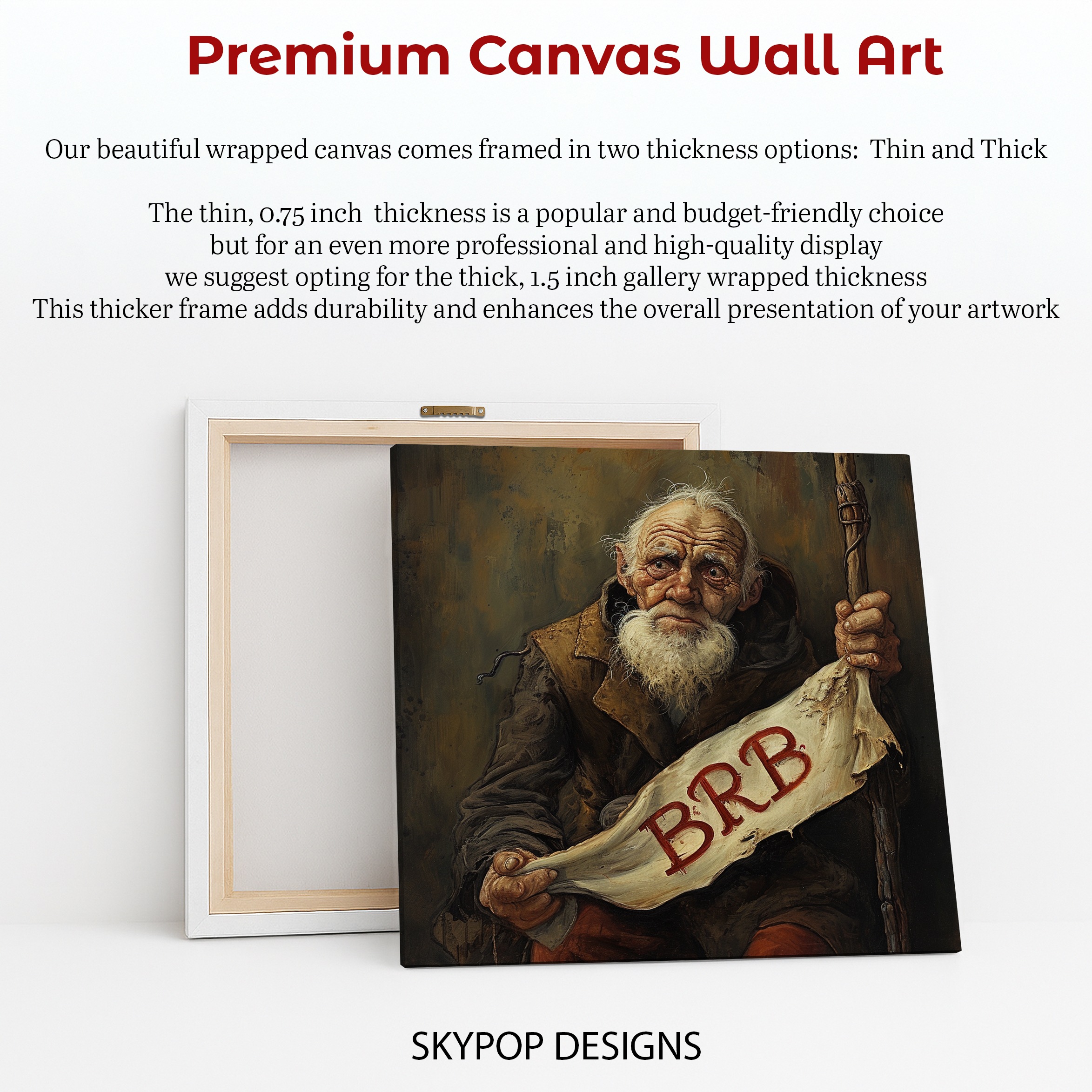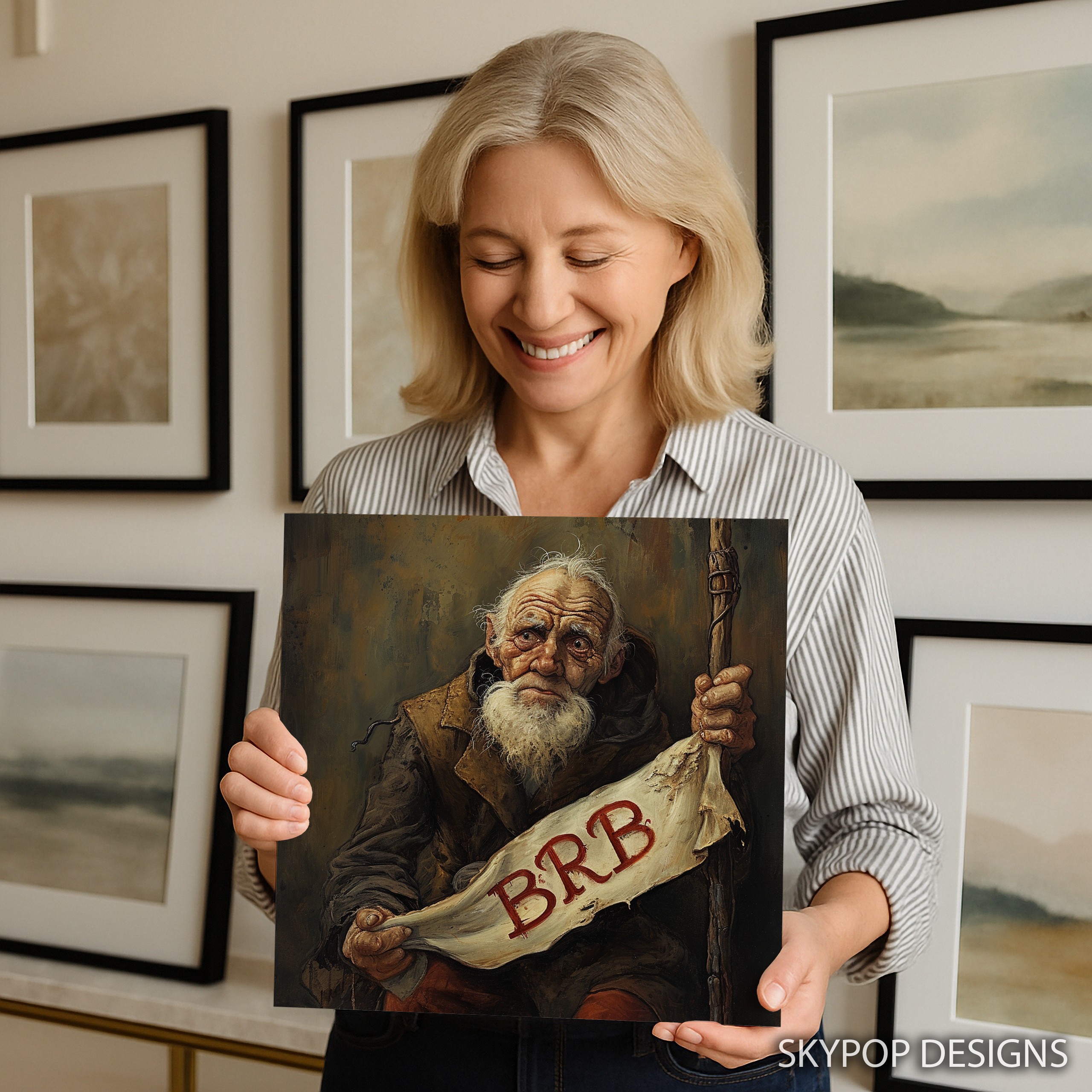 Transform your space with this captivating canvas wall art featuring a weathered elderly man holding a sign that reads “BRB”. This striking portrait poster brings depth and character to any room, perfect for those who appreciate classic art with a modern twist. The intricate details of the man’s wrinkled face, wispy white beard, and piercing gaze create an emotional connection that draws viewers in. Ideal for rustic living rooms or traditional office spaces, this piece adds a touch of wisdom and whimsy to your decor. The muted brown tones and textured background give a sense of timelessness, while the unexpected “BRB” sign adds a contemporary edge. This versatile canvas wall art works beautifully in bohemian-inspired spaces or as a statement piece in minimalist settings. The high-quality printing captures every nuance of the original artwork, from the man’s expressive eyes to the worn texture of his clothing. Whether displayed in a cozy library nook or as a conversation starter in your hallway, this unique blend of vintage style and modern humor is sure to spark interest. Great as a thoughtful gift for art lovers or to add personality to your own space. Elevate your home’s atmosphere with this compelling portrait that celebrates the intersection of age, wisdom, and contemporary culture. Bring this intriguing canvas art into your life today and experience the power of visual storytelling in your everyday environment.