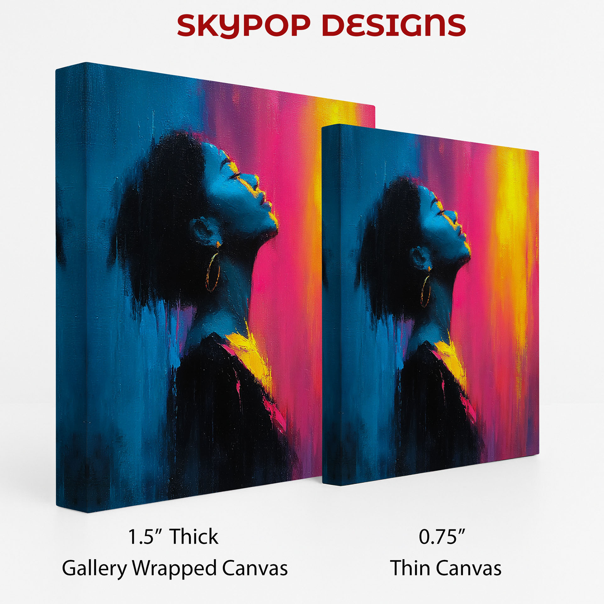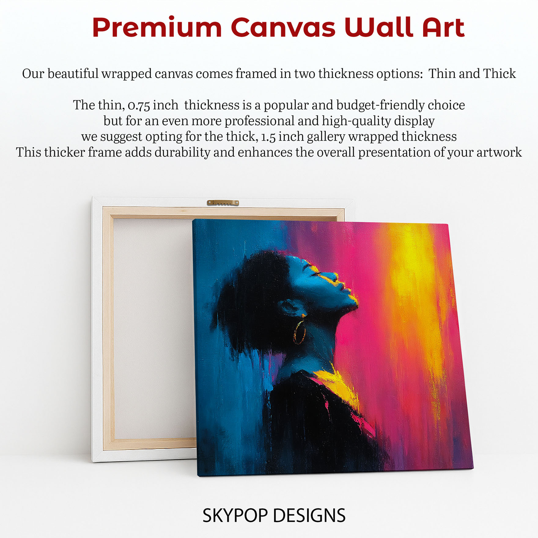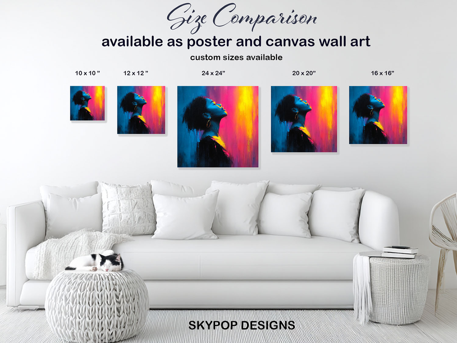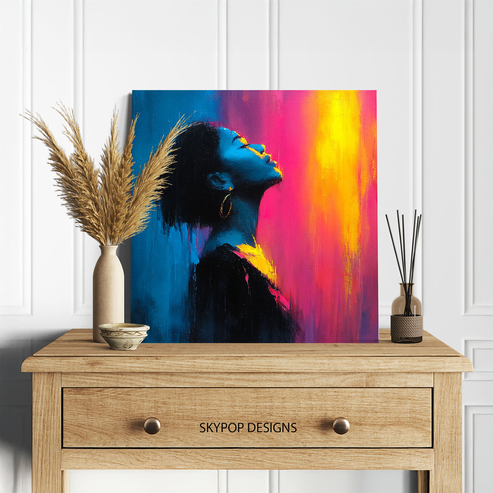 Transform your space with this captivating woman silhouette canvas wall art that radiates energy and passion. This striking poster or canvas wall art features a modern figurative style with bold strokes and a vibrant multicolor palette, creating a truly eye-catching piece. The dynamic interplay of blue, pink, and yellow hues enhances the dramatic portrayal of thought and emotion. This African American art piece is perfect for contemporary living rooms or as a statement in a modern office space, adding a touch of sophistication and bold personality to your decor. Its bohemian appeal makes it a wonderful addition to eclectic interiors, offering warmth and vibrancy. The artwork’s emotional depth and striking color combinations inspire creativity and transform any room into a more engaging environment. High-quality printing ensures the rich textures and vivid colors of this wall art are beautifully rendered, making it a focal point that sparks conversation. Ideal as a thoughtful housewarming gift or to refresh your home’s ambiance, this versatile canvas art complements various interior design trends. Elevate your home with this stunning piece that celebrates human spirit and artistic expression. Make this vibrant woman canvas art the centerpiece of your collection and infuse your space with color and life. This artwork is perfect for enhancing modern bedroom decor or adding character to a chic entryway.