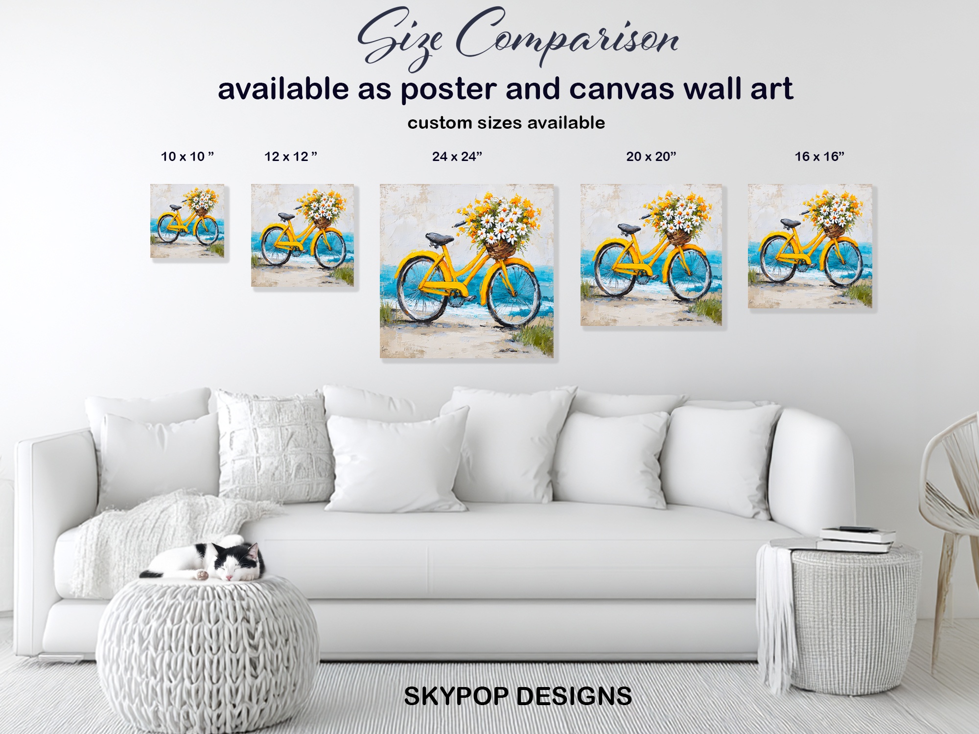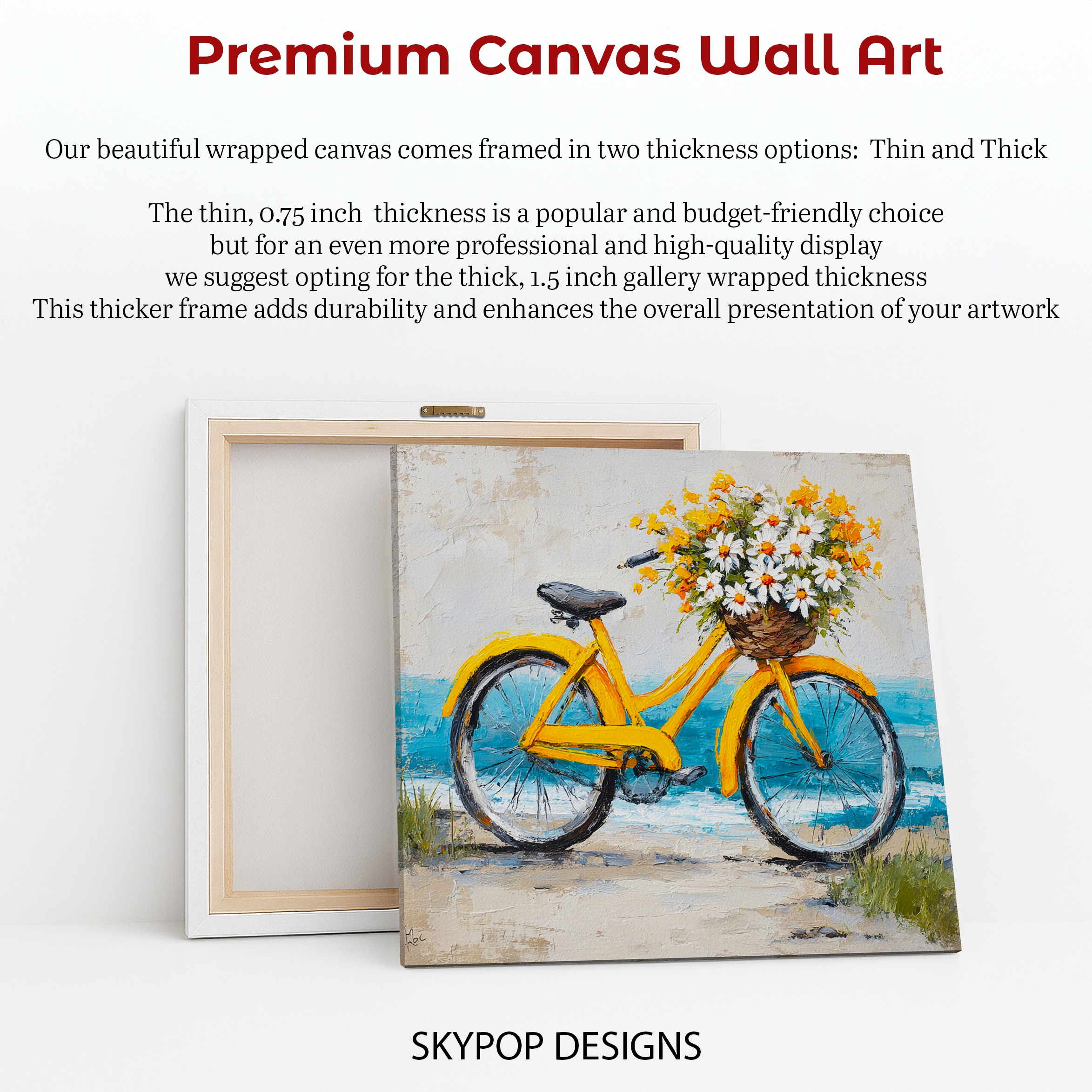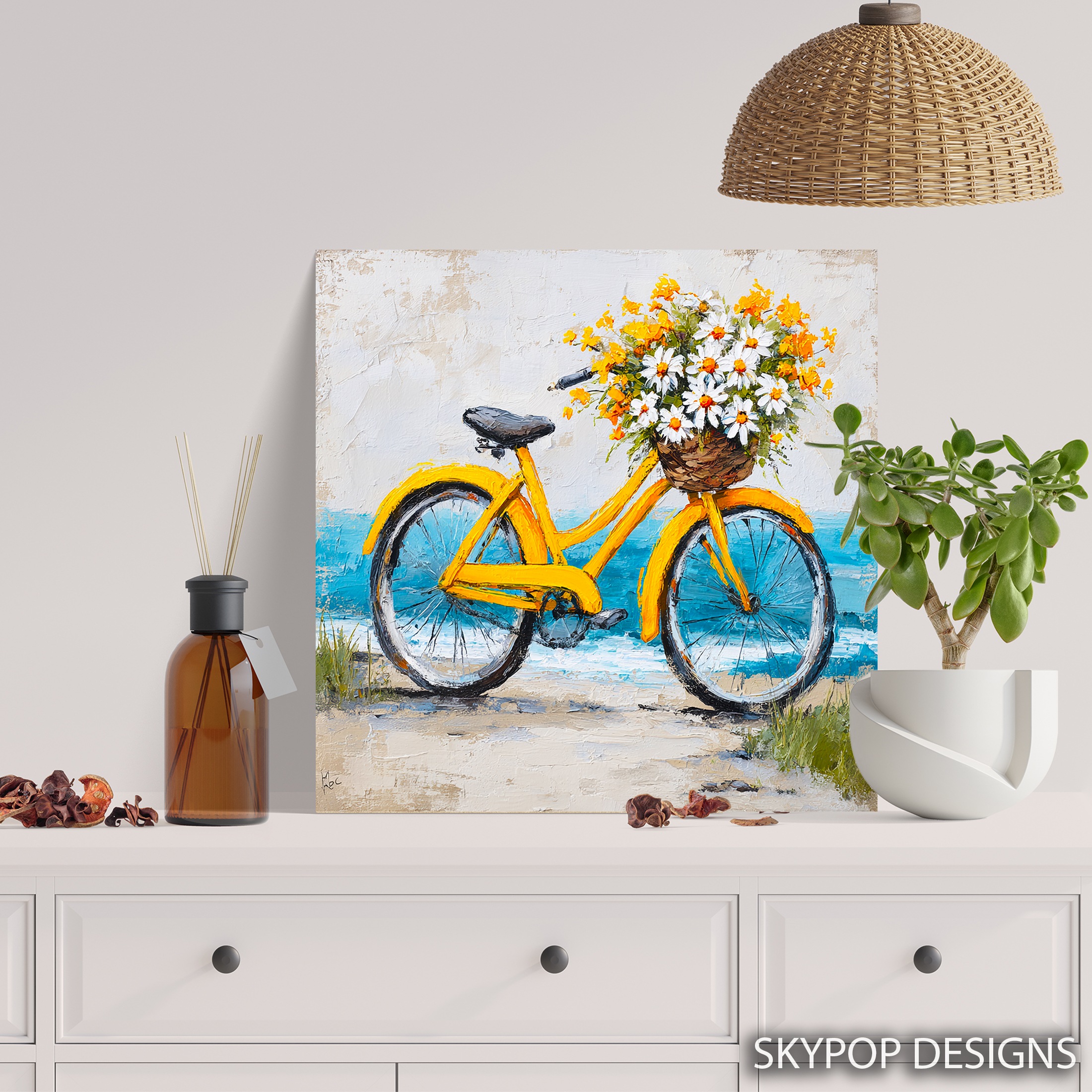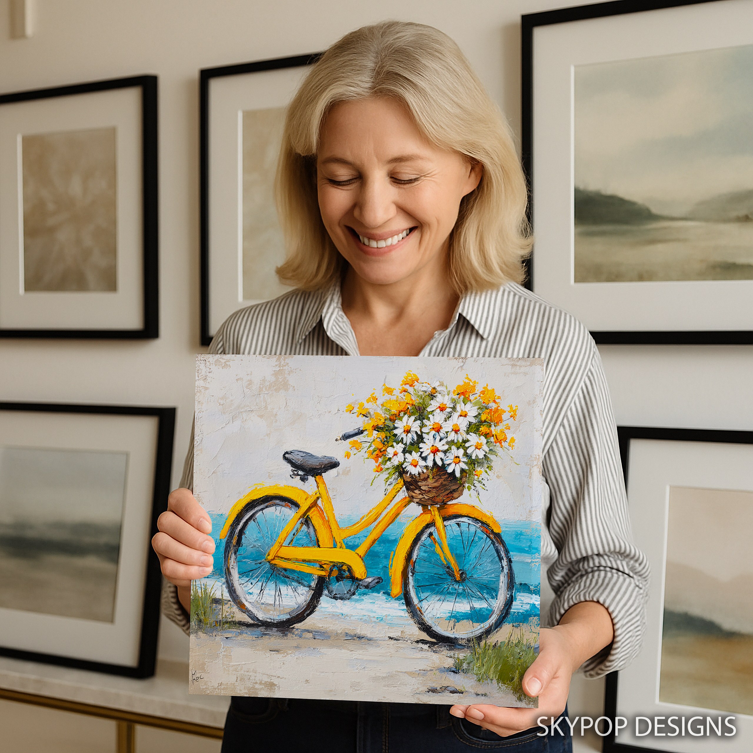 Bring a burst of summer charm into your home with this delightful yellow bicycle canvas wall art. This vibrant piece showcases a cheerful yellow bike adorned with a basket overflowing with white daisies and golden blooms, set against a serene coastal backdrop. Perfect for brightening up any living room, bedroom, or entryway, this poster captures the essence of carefree summer days and seaside adventures. The textured brushstrokes add depth and character, making this canvas a standout addition to rustic or farmhouse decor styles. Ideal for those seeking to infuse their space with a touch of vintage-inspired whimsy, this artwork serves as a focal point that sparks joy and conversation. The calming blue tones of the water create a soothing atmosphere, while the pops of yellow and white flowers add energy and life to any room. Whether you’re decorating a cozy sunroom or looking for the perfect housewarming gift, this versatile piece adapts beautifully to various interior themes. The high-quality printing ensures every detail, from the bicycle’s spokes to the delicate flower petals, is captured with stunning clarity. Transform your living space with this charming bicycle and flower art that celebrates the simple pleasures of life and nature’s beauty. Elevate your wall decor and bring the outdoors in with this captivating canvas that’s sure to become a cherished part of your home.