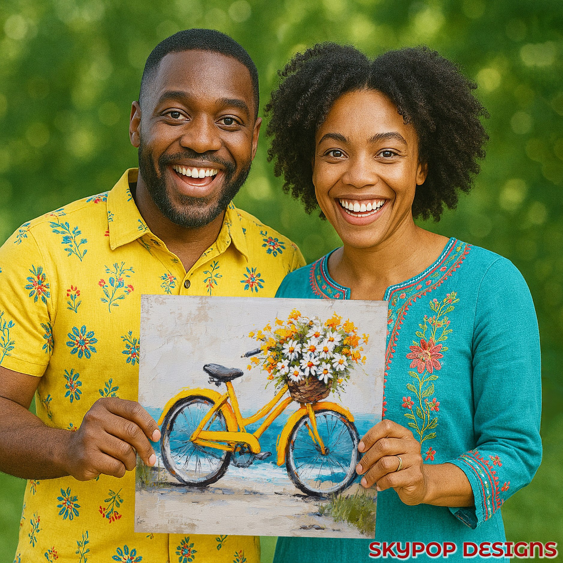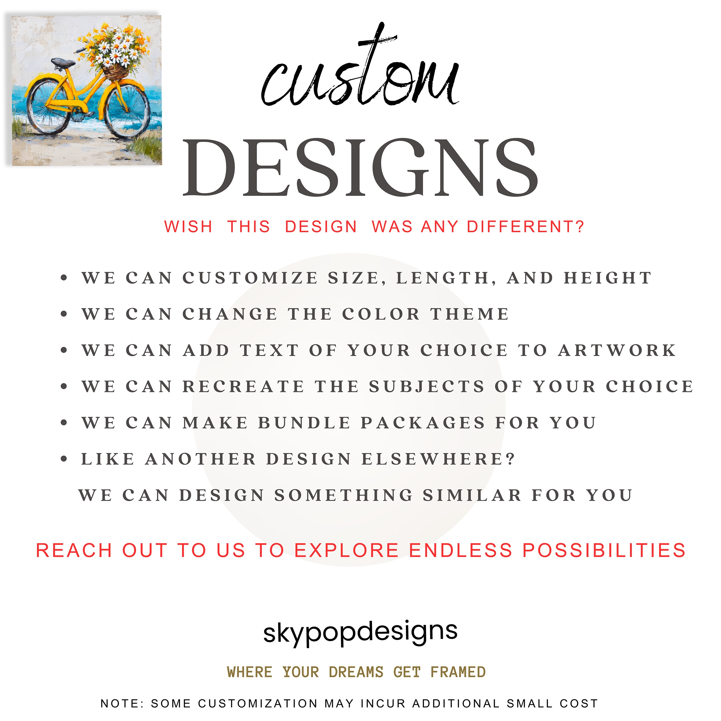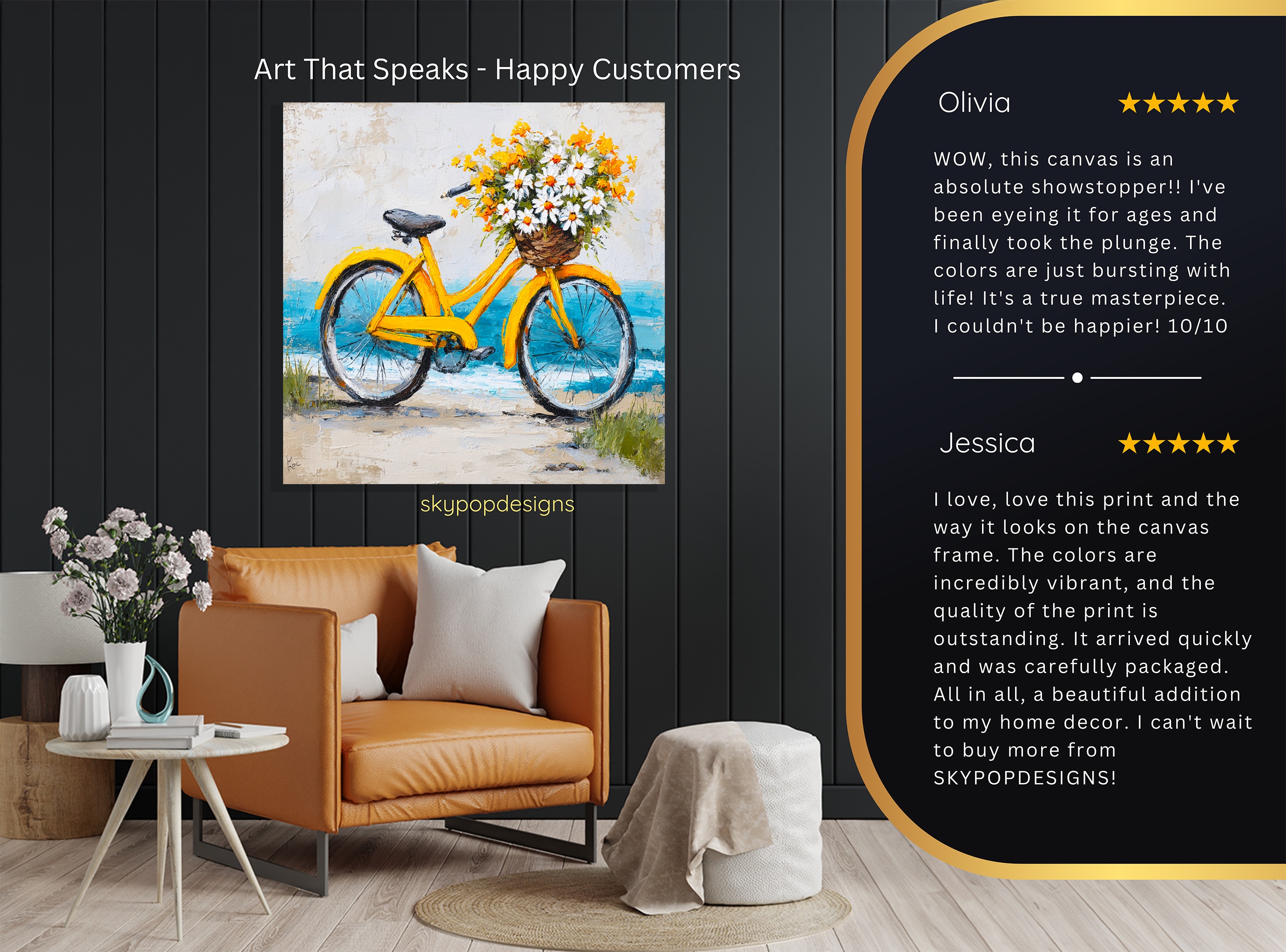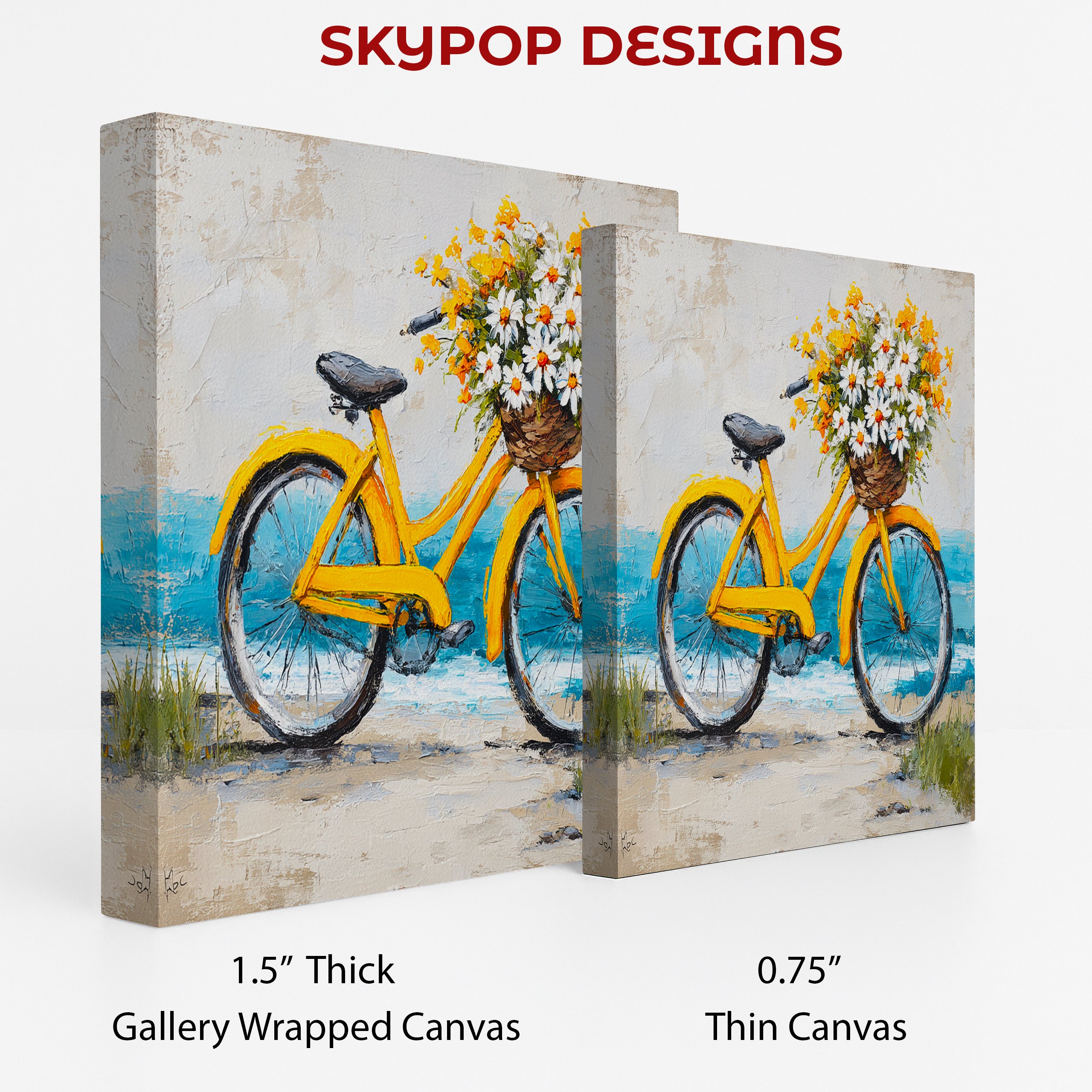 Bring a burst of summer charm into your home with this delightful yellow bicycle canvas wall art. This vibrant piece showcases a cheerful yellow bike adorned with a basket overflowing with white daisies and golden blooms, set against a serene coastal backdrop. Perfect for brightening up any living room, bedroom, or entryway, this poster captures the essence of carefree summer days and seaside adventures. The textured brushstrokes add depth and character, making this canvas a standout addition to rustic or farmhouse decor styles. Ideal for those seeking to infuse their space with a touch of vintage-inspired whimsy, this artwork serves as a focal point that sparks joy and conversation. The calming blue tones of the water create a soothing atmosphere, while the pops of yellow and white flowers add energy and life to any room. Whether you’re decorating a cozy sunroom or looking for the perfect housewarming gift, this versatile piece adapts beautifully to various interior themes. The high-quality printing ensures every detail, from the bicycle’s spokes to the delicate flower petals, is captured with stunning clarity. Transform your living space with this charming bicycle and flower art that celebrates the simple pleasures of life and nature’s beauty. Elevate your wall decor and bring the outdoors in with this captivating canvas that’s sure to become a cherished part of your home.