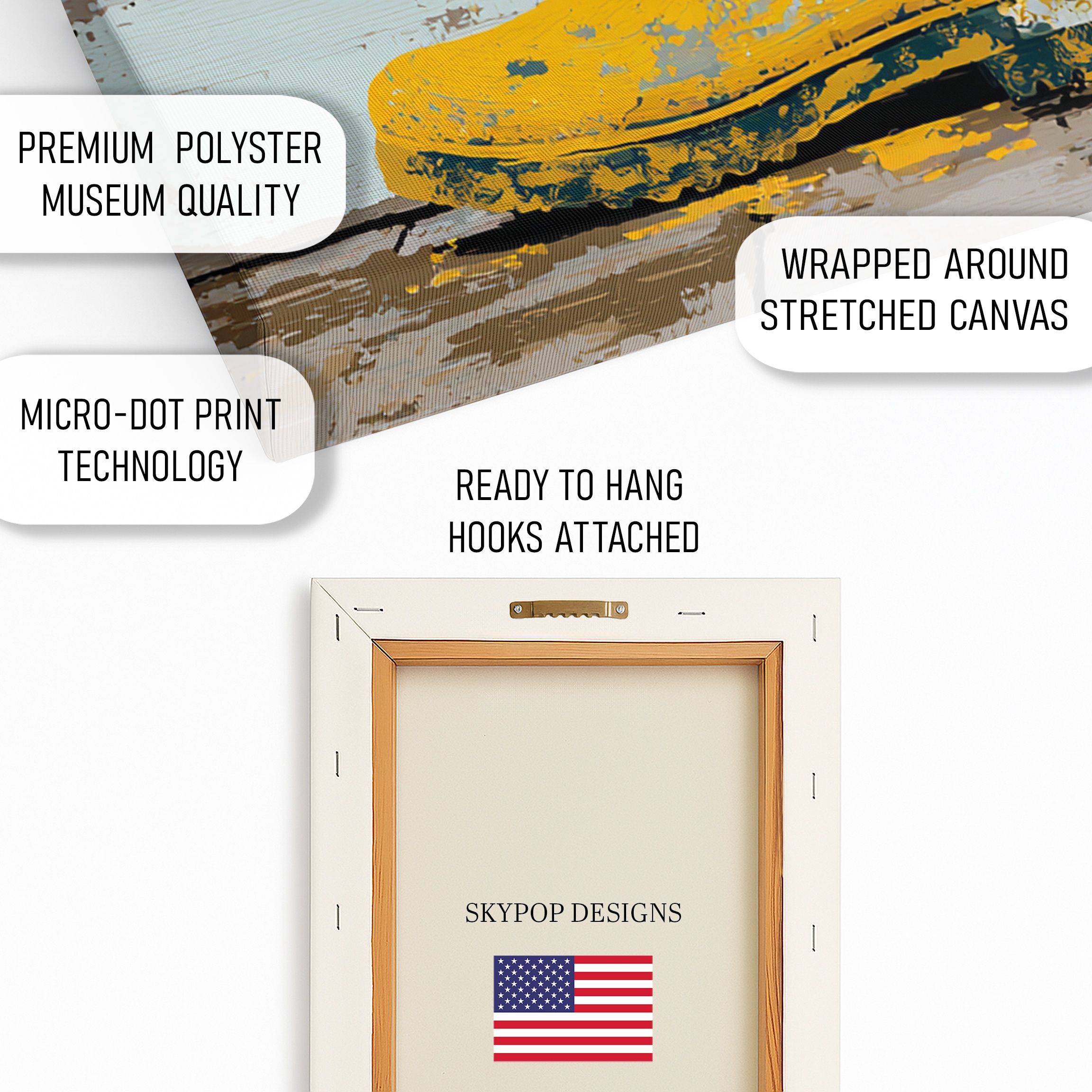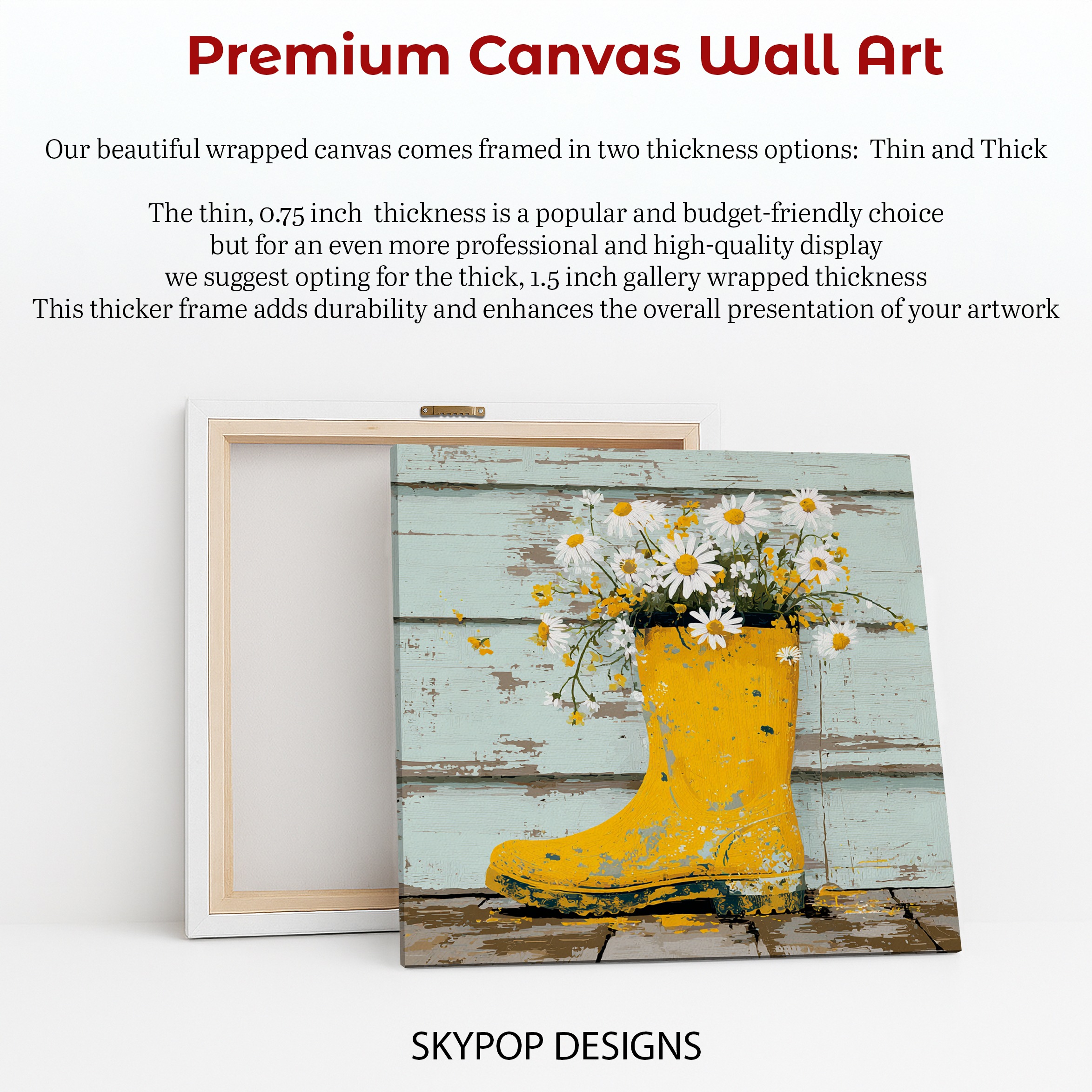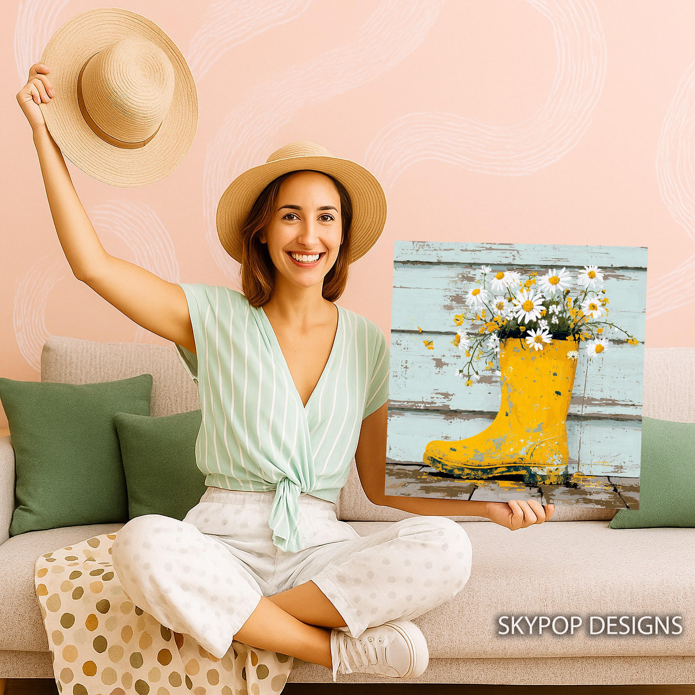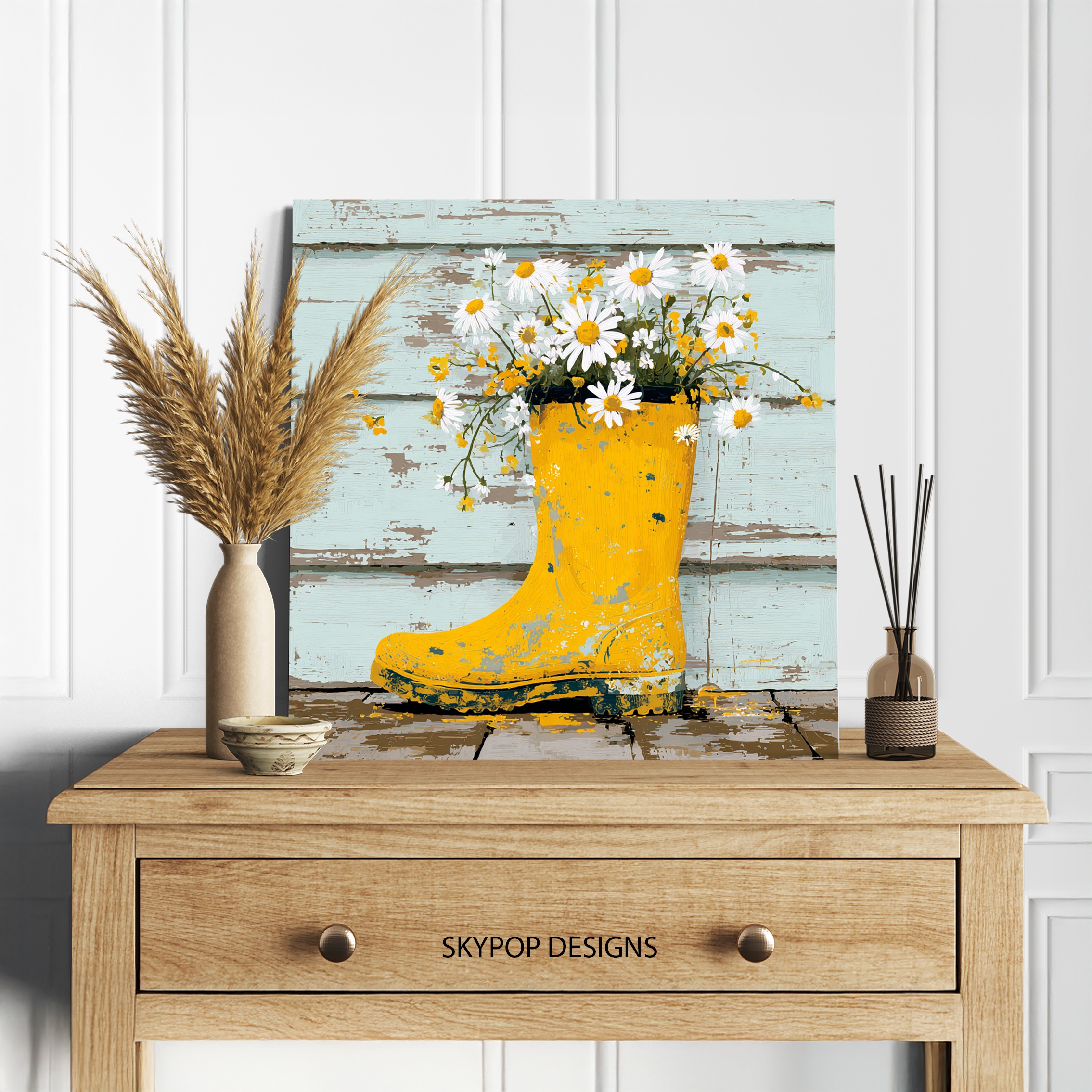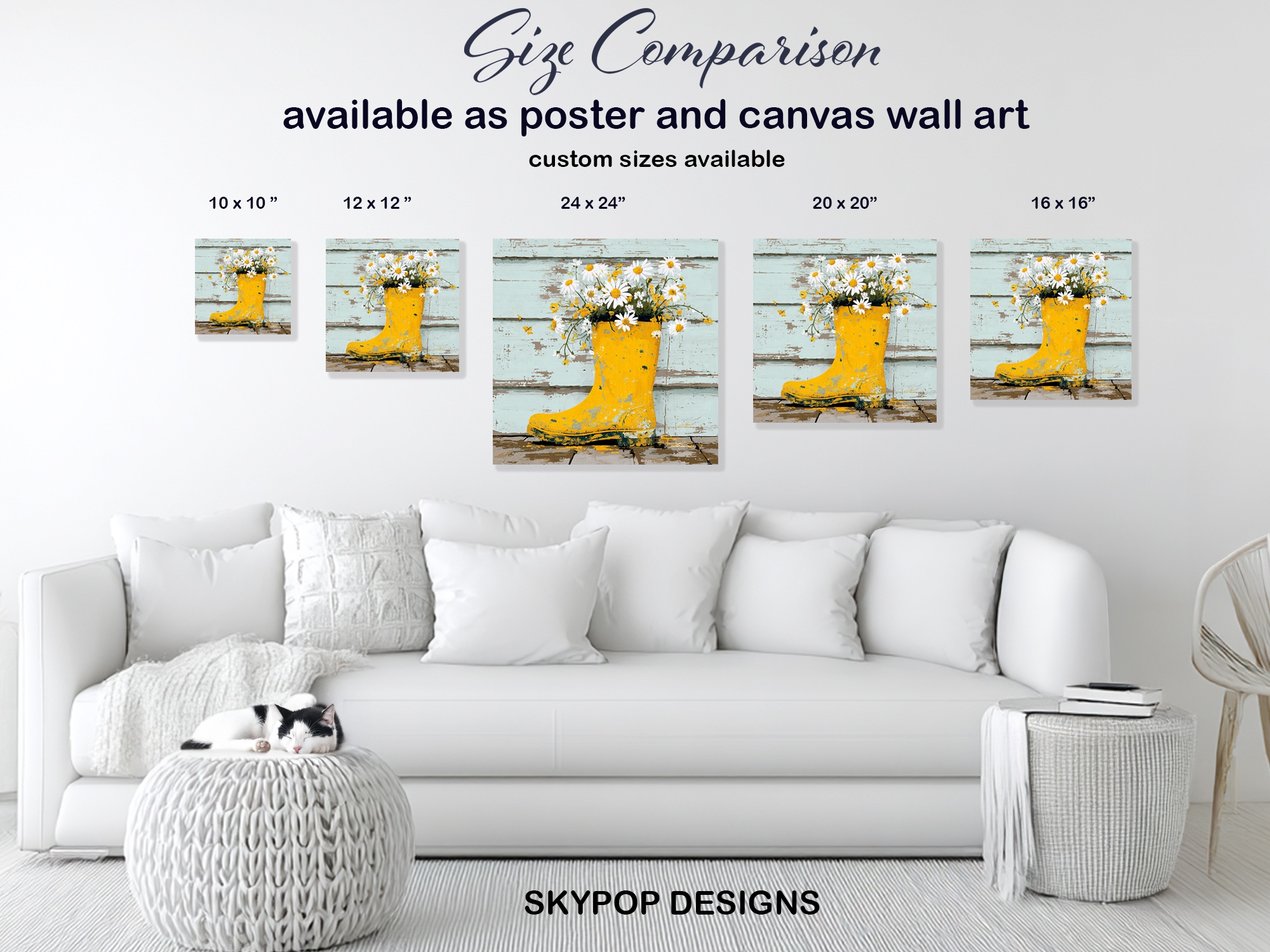 Brighten your space with this charming yellow rainboot flower canvas wall art, perfect for adding a touch of whimsy to any room. This vibrant poster features a weathered yellow rubber boot overflowing with cheerful daisies and wildflowers, set against a rustic, distressed wood background. Ideal for farmhouse or shabby chic decor, this piece brings the fresh feeling of a spring garden indoors. The striking contrast between the sunny yellow boot and delicate white flowers creates an eye-catching focal point that instantly lifts the mood of your entryway, mudroom, or laundry room. This versatile canvas art works beautifully in sunrooms, adding a pop of color and nature-inspired charm. The vintage-inspired design evokes nostalgia and warmth, making it a perfect housewarming gift or addition to your own home. High-quality printing captures every detail, from the boot’s worn texture to the flower petals’ delicate edges. Whether you’re looking to refresh your seasonal decor or add a permanent touch of country charm, this unique wall art brings the outdoors in with style. Transform your space today with this delightful blend of floral beauty and rustic appeal – a true celebration of simple pleasures and natural beauty.