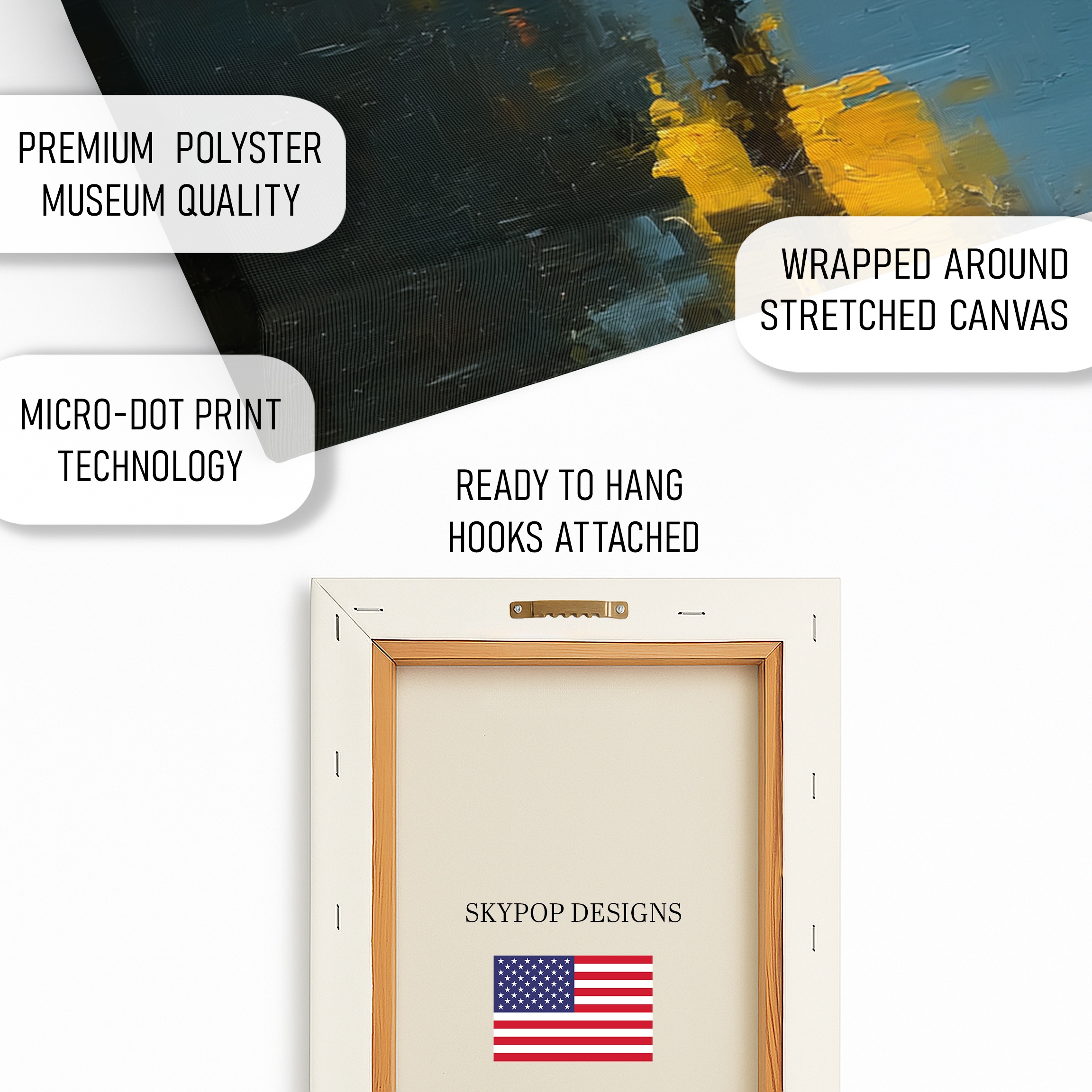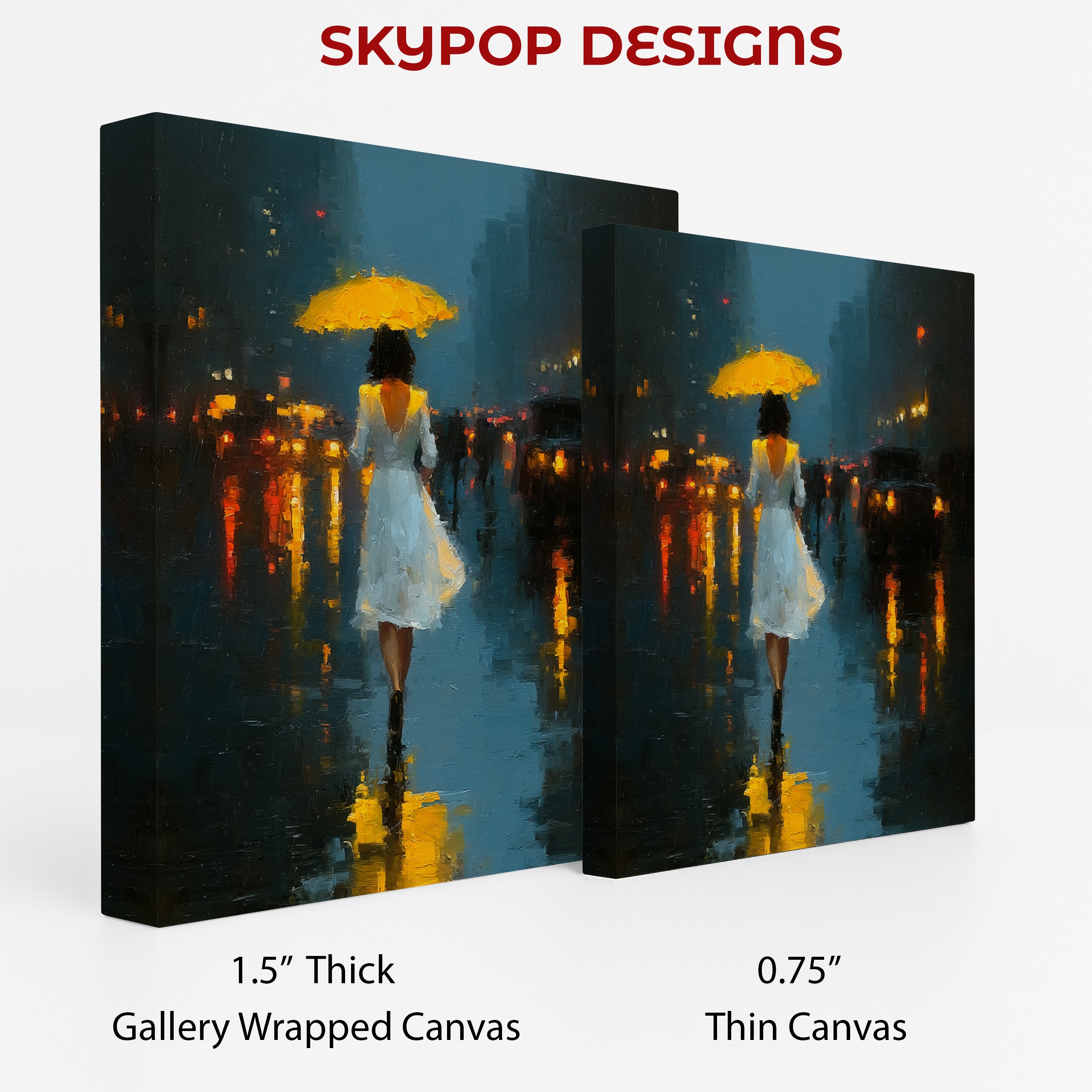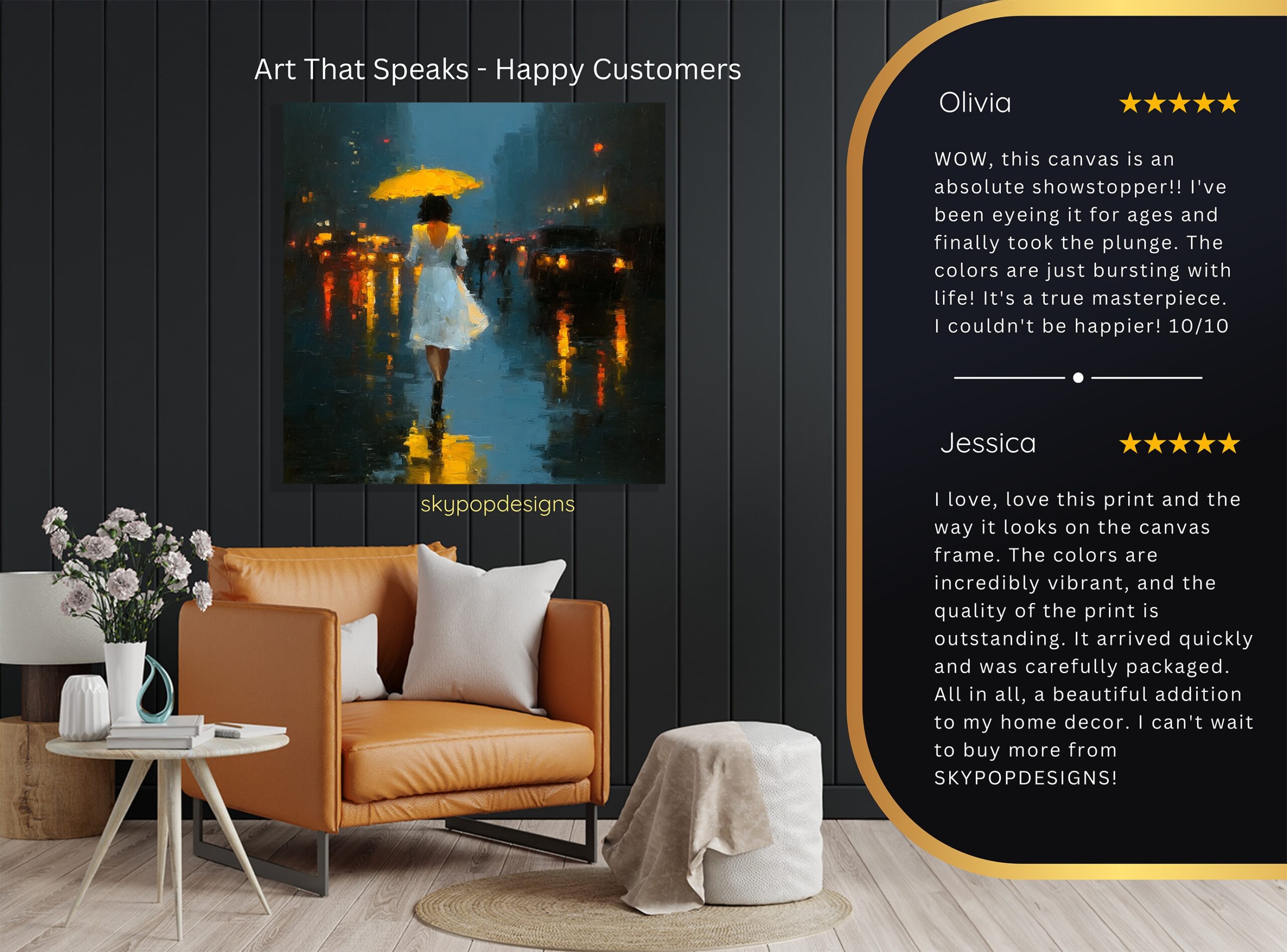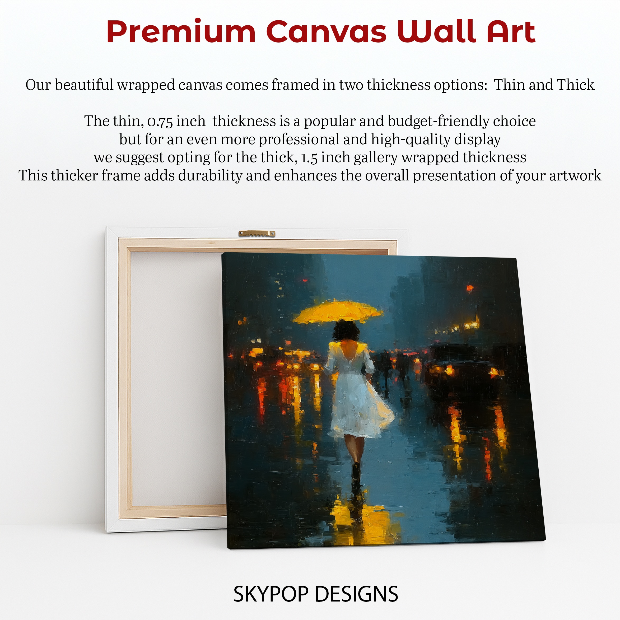 Transform your space with this captivating canvas wall art featuring a lone figure with a bright yellow umbrella on a rainy city night. This stunning poster brings the essence of urban life into your home, perfect for modern living room wall decor or as a statement piece in a minimalist bedroom. The vibrant yellow umbrella pops against the moody blue tones of the city, creating a striking contrast that draws the eye. Ideal for those who love contemporary street scenes, this canvas art captures the romance and mystery of a rainy night in the city. The impressionistic style adds texture and depth, making the lights and reflections come alive on your wall. Whether you’re looking to add a touch of sophistication to your office or create a focal point in your hallway, this versatile piece adapts beautifully to various spaces. The emotional appeal of the solitary figure braving the elements resonates with viewers, making it a great conversation starter. High-quality printing ensures every brushstroke and color nuance is faithfully reproduced, bringing gallery-quality art into your home. This canvas wall art is not just decor; it’s a mood-enhancer, bringing a sense of urban cool and contemplative atmosphere to any room. Perfect as a housewarming gift or to refresh your own space, this artwork invites you to pause and reflect on life’s quiet moments. Elevate your interior design today with this enchanting blend of city life and artistic expression.