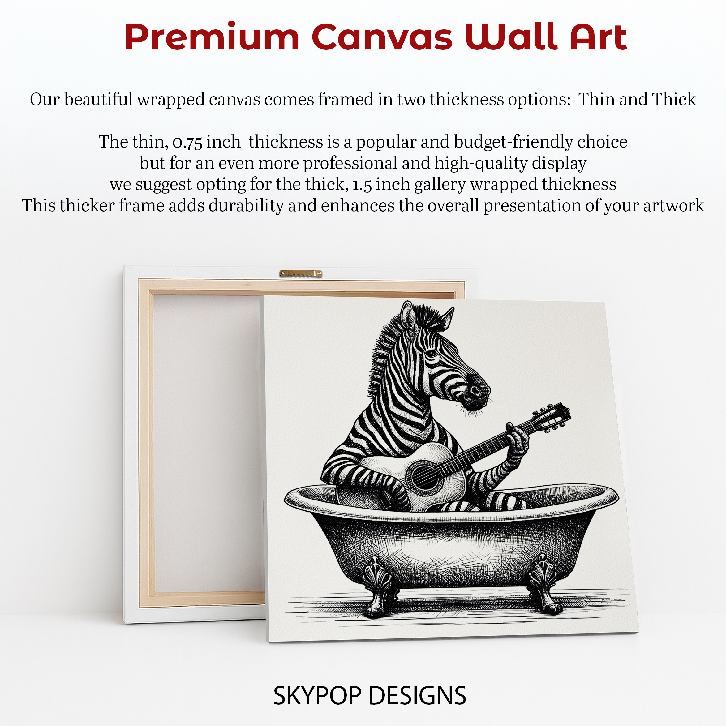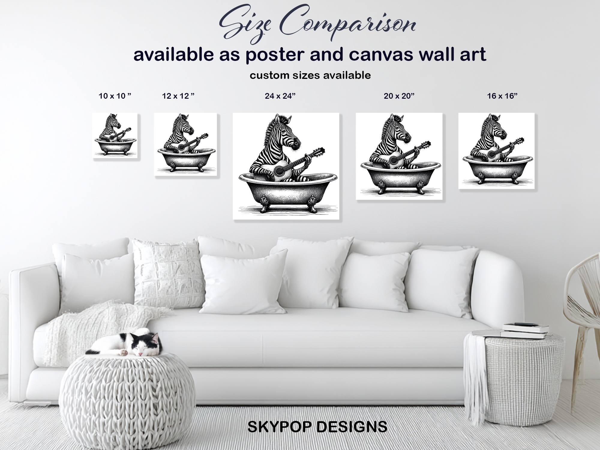 Transform your space with this quirky and captivating zebra canvas wall art, featuring a musical twist that’s sure to make you smile. This striking poster showcases a zebra sitting in a vintage bathtub, strumming an acoustic guitar with surprising dexterity. The bold black and white stripes of the zebra create a stunning contrast against the brown guitar and ornate white bathtub, making this piece a true conversation starter. Perfect for contemporary bathrooms, bohemian living rooms, or eclectic bedrooms, this unique wall art adds a touch of whimsy and charm to any decor style. The intricate linework and attention to detail bring this surreal scene to life, inviting viewers to imagine the delightful melodies this zebra might play. Ideal for music lovers, animal enthusiasts, or anyone with a sense of humor, this canvas art effortlessly blends nature and creativity. The unexpected combination of a zebra, bathtub, and guitar creates a playful atmosphere that can brighten up a dull office or add personality to a neutral space. Available in various sizes, this versatile artwork adapts to different room layouts and makes for an unforgettable housewarming or birthday gift. Elevate your home decor with this eye-catching zebra guitar art that celebrates the joy of music and the beauty of the animal kingdom. Add a touch of whimsy to your walls and let this zebra serenade your space today!
