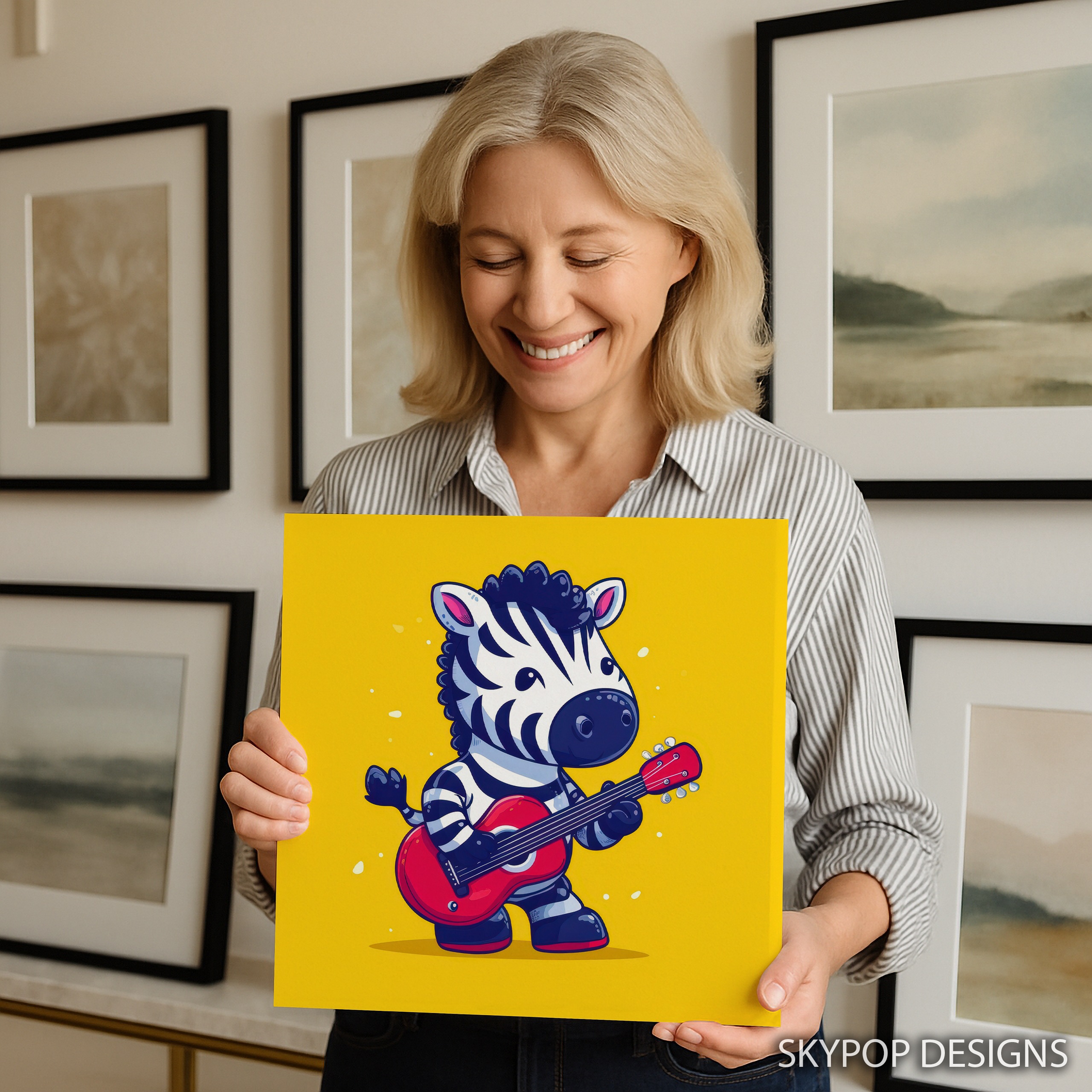 Bring a smile to any room with this vibrant Zebra canvas wall art, showcasing a cool zebra rocking out on a red guitar. This charming piece adds a playful splash of color and personality, perfect for transforming a child’s room into a fun-filled space or adding a quirky touch to a living room. The striking contrast of the yellow background with the zebra’s classic stripes and the bold red guitar creates a captivating visual that’s sure to be a conversation starter. Whether you’re looking for modern bedroom decor or a unique housewarming gift, this versatile poster or canvas wall art fits seamlessly into contemporary or bohemian styles. The energetic pose and cheerful design inspire a sense of joy and creativity, making it an ideal addition to a music lover’s collection or any space that needs a pop of fun. This high-quality canvas art is printed to last, ensuring the vibrant colors and sharp details bring lasting appeal to your wall decor. Elevate your home with this eye-catching zebra artwork, a perfect blend of animal art and modern graphic design. Make a statement and inject some playful energy into your space today with this delightful zebra guitar canvas print. It’s a fantastic gift for birthdays, holidays, or just to brighten someone’s day.