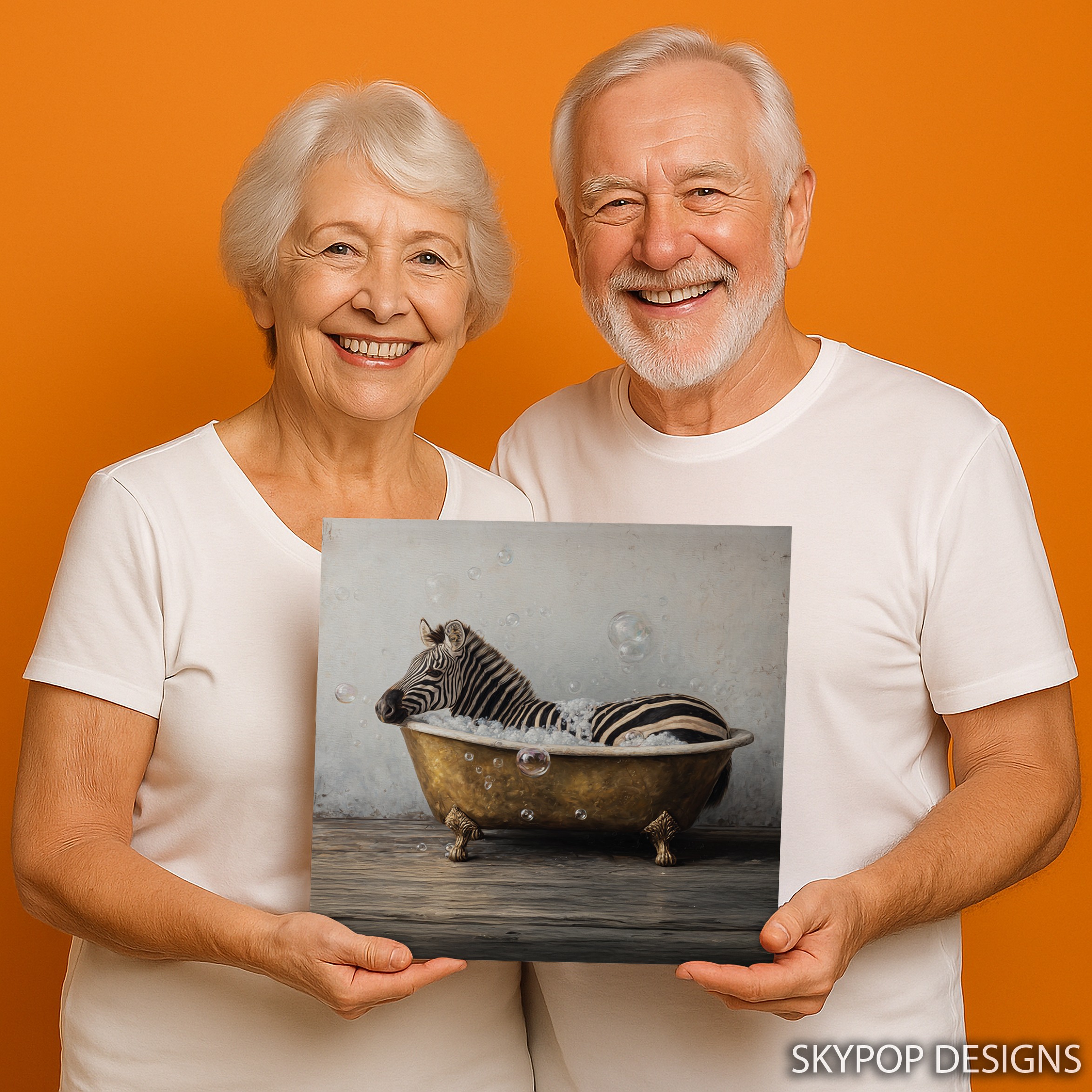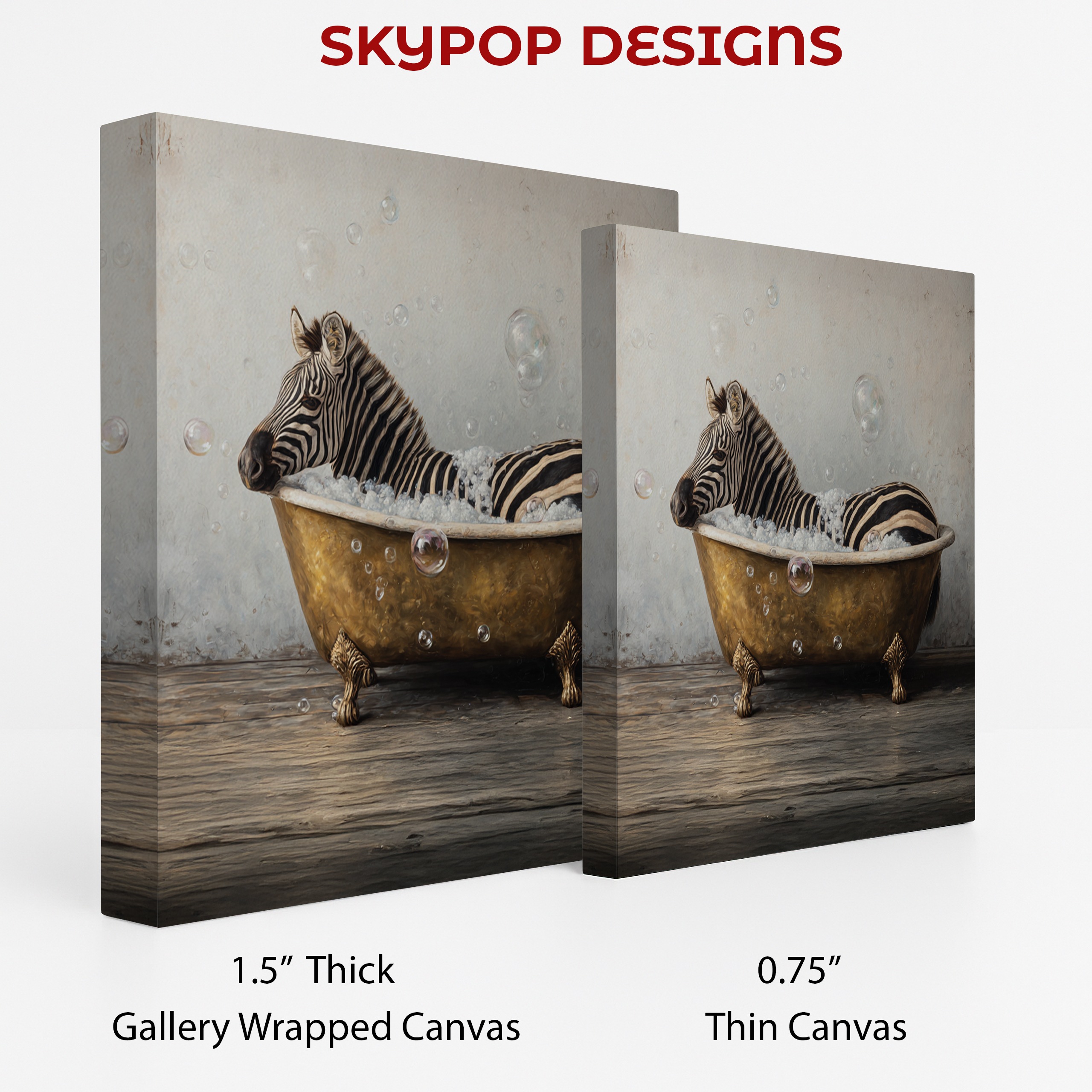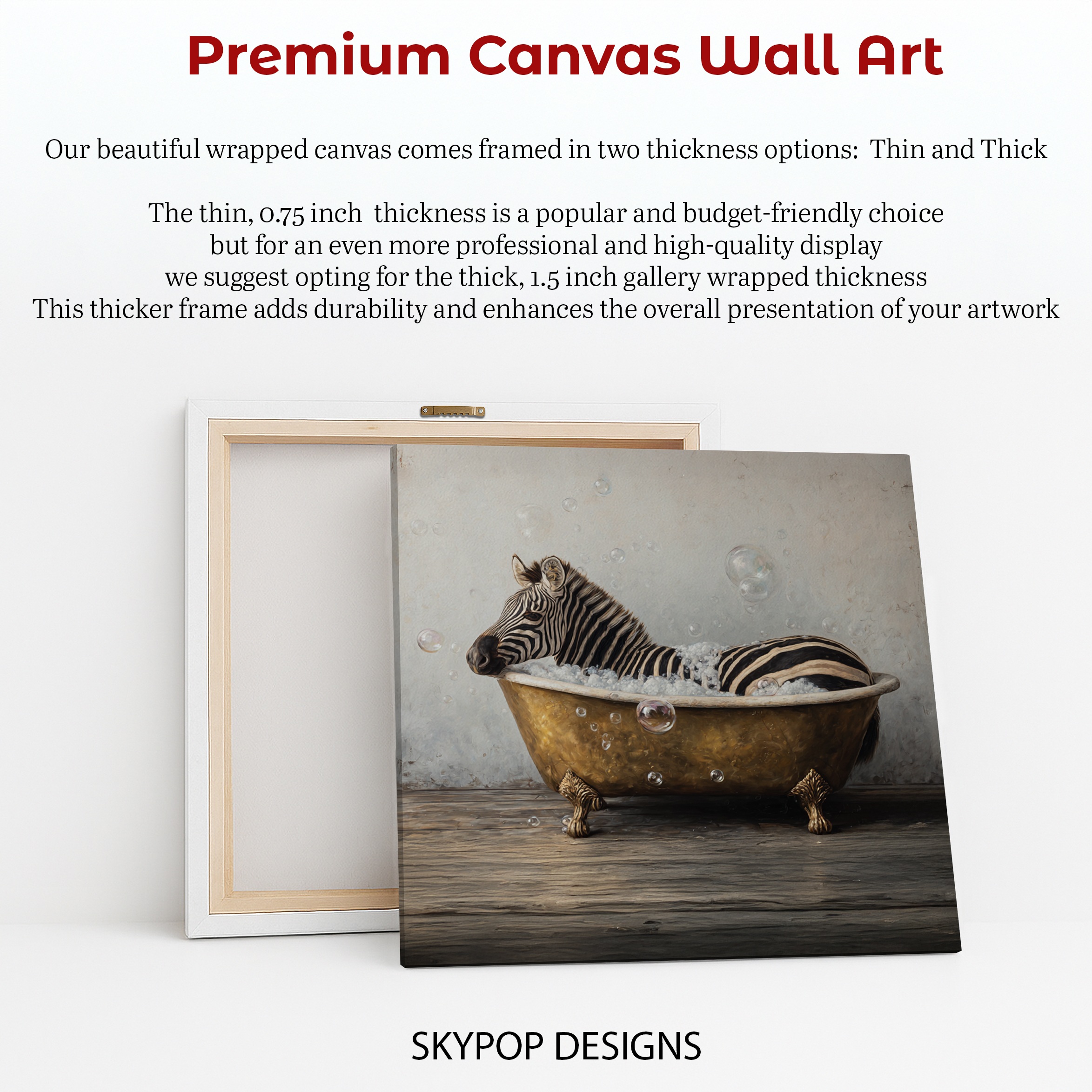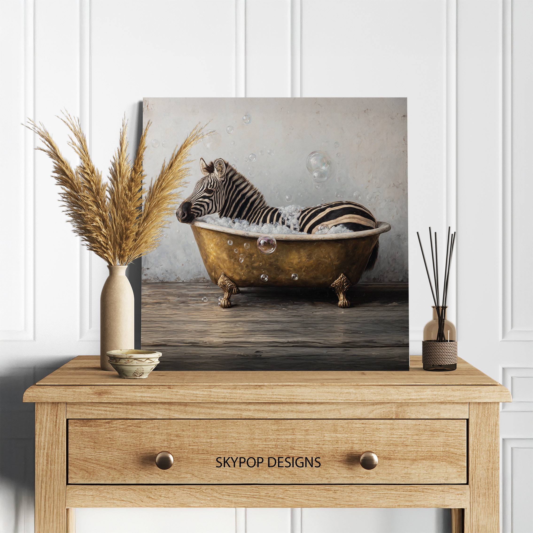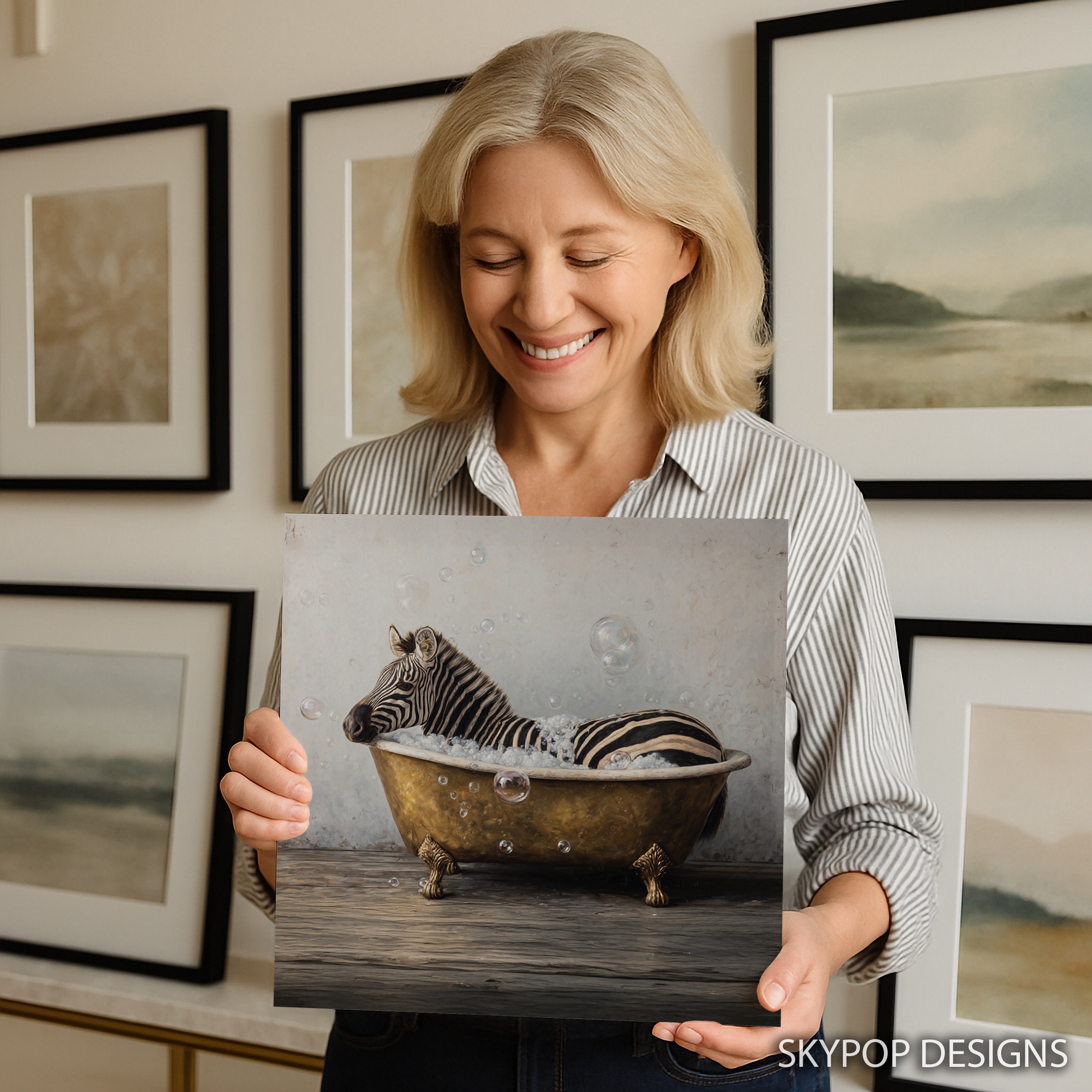 Dive into whimsy with this unexpected zebra bath canvas wall art that’s sure to make a splash in any room. This striking poster features a surreal scene of a zebra lounging in a vintage gold bathtub, surrounded by playful soap bubbles. Perfect for adding a touch of humor and imagination to contemporary bathrooms or modern bedrooms, this unique piece transforms ordinary spaces into conversation starters. The bold black and white stripes of the zebra pop against the warm gold tones of the bathtub, creating a visually stunning contrast that draws the eye. Ideal for animal lovers and those with a quirky sense of style, this canvas wall art brings a smile to faces and injects personality into your decor. The detailed artwork captures every texture, from the zebra’s sleek coat to the bubbly foam, making it a captivating focal point in living rooms or home offices. This versatile piece works well in bohemian-inspired spaces or as an unexpected element in minimalist designs. Whether you’re looking to liven up a guest bathroom or add some whimsy to a child’s bedroom, this zebra bath time art delivers big on charm and visual interest. High-quality printing ensures vibrant colors and crisp details that will stand the test of time. Give your walls a wild makeover and let this playful zebra artwork become the star of your home decor collection. Transform your space today with this delightful blend of nature and imagination!