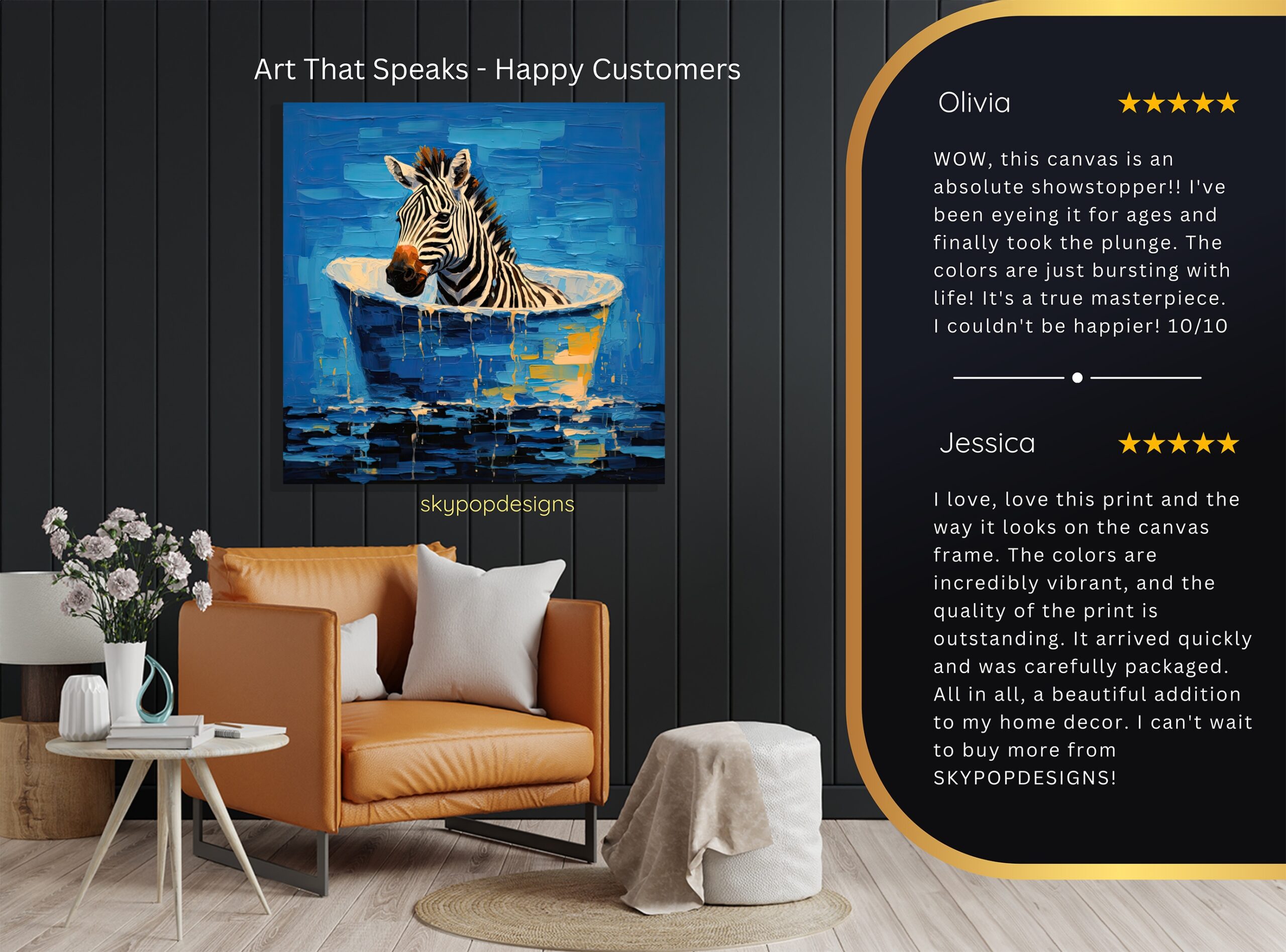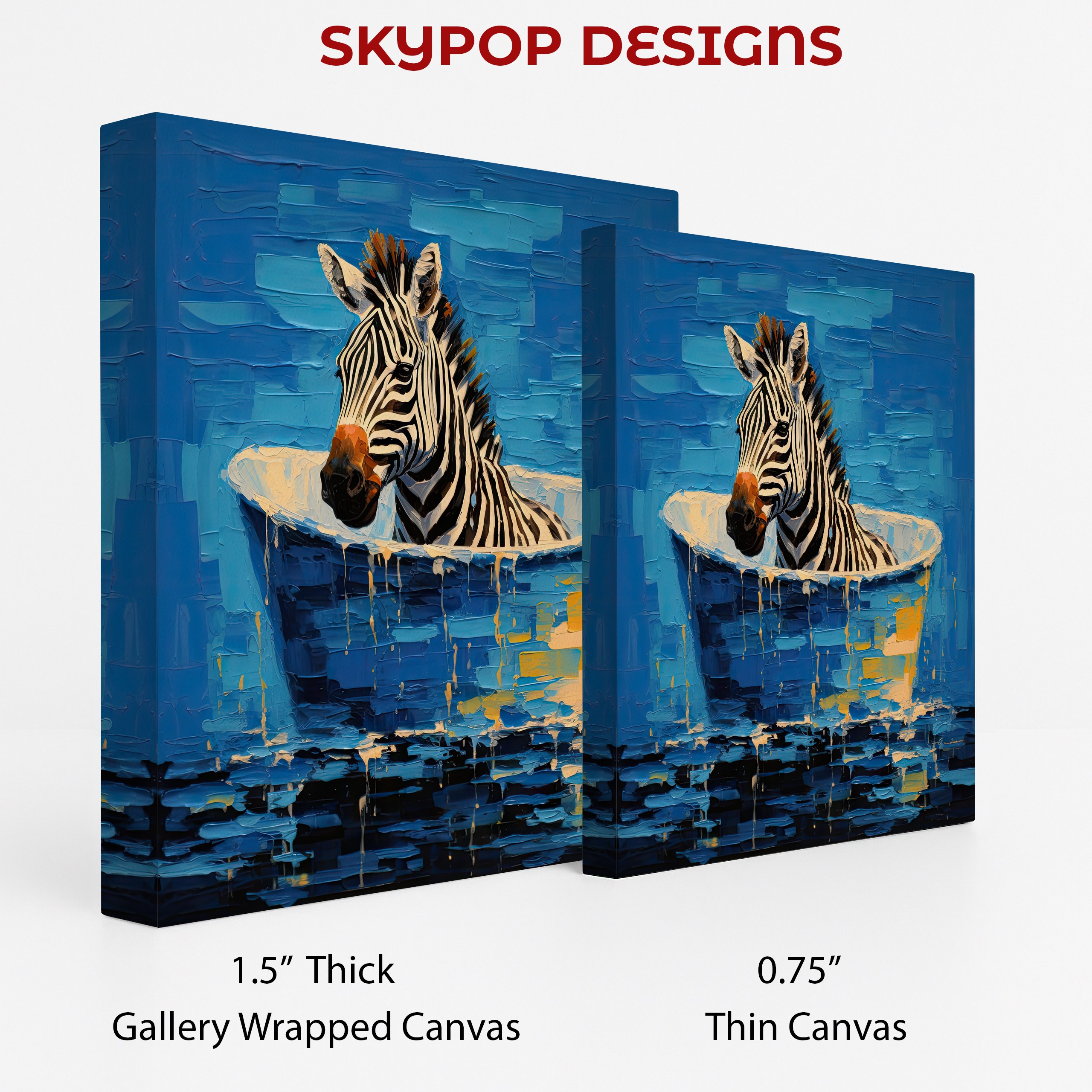 Refresh your space with this unique zebra canvas wall art featuring a zebra enjoying a bubble bath. This captivating poster or canvas wall art brings a playful yet sophisticated element to any room. The vibrant blues and striking black and white stripes of the zebra create a stunning focal point that is sure to spark joy and conversation. Transform your bathroom into a spa-like retreat with this whimsical animal art, or add a pop of personality to your living room or bedroom. The abstract, textured brushstrokes give this canvas wall art a modern feel, perfect for contemporary and bohemian decor styles. This piece is ideal for anyone who loves animals and wishes to add a touch of lighthearted fun to their home decor. It makes a perfect gift for housewarmings, birthdays, or holidays, bringing smiles and brightening any atmosphere. Available in various sizes, this high-quality canvas print ensures the vivid colors and intricate details are showcased beautifully. Elevate your wall decor with this eye-catching zebra artwork that embodies relaxation and fun. Add this charming zebra poster to your collection and celebrate the simple pleasures of a good bath, making your home feel more welcoming and personal. Let this delightful artwork enhance your everyday life with its unique charm and vibrant appeal.