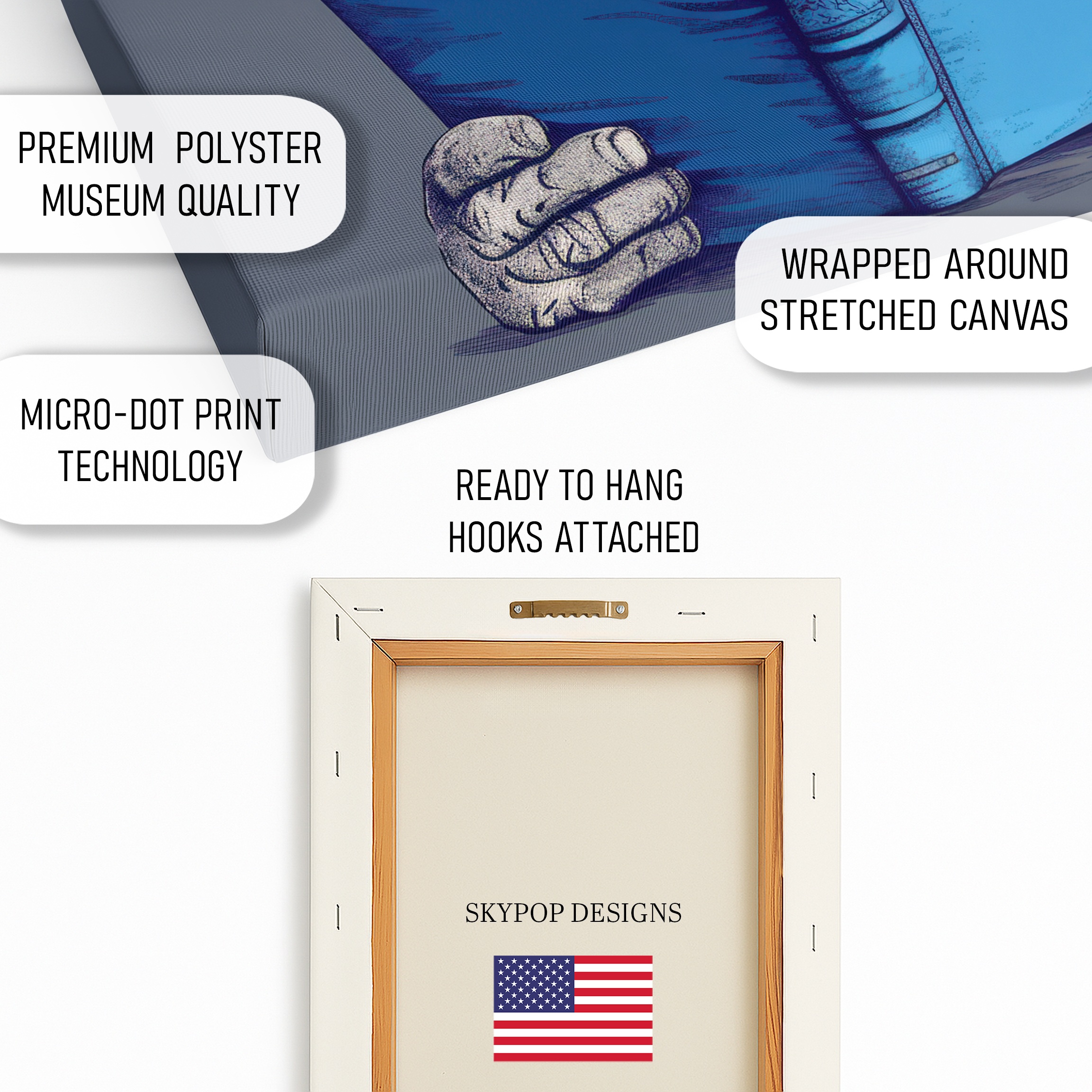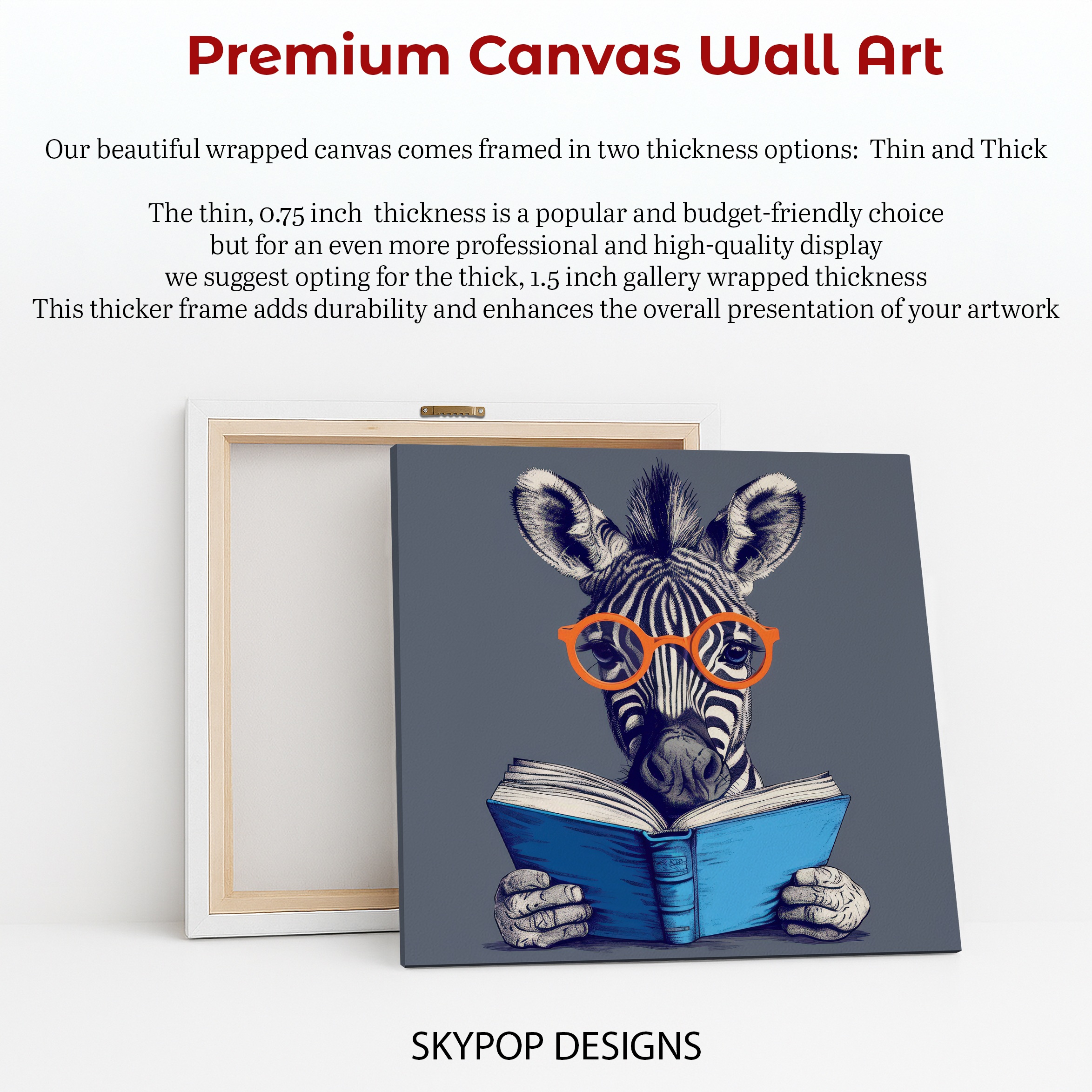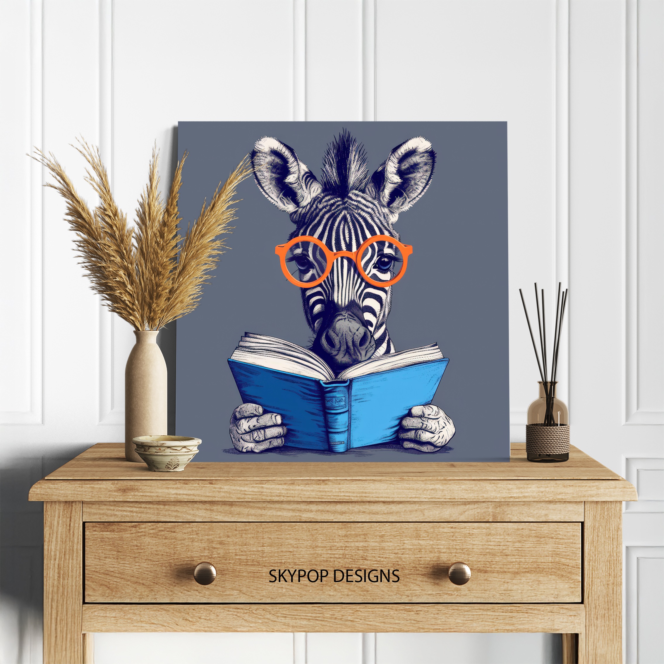 Keywords: Zebra canvas art, Animal wall art, Contemporary art, Whimsical art, Modern decor, Bohemian decor, Black and white art, Blue and orange accents, Grey animal print, Zebra reading book, Living room art, Bedroom decor, Office wall art, Kitchen art, Art for book lovers, Unique wall decor, Statement artwork, Expressive art, Intellectual art, Contemplative art, Sophisticated art, Quirky charm, Eye-catching art, High-quality canvas print, Gift for animal lovers, Gift for art enthusiasts, Bold color contrast, Detailed illustration, Home decor inspiration, Studious zebra art