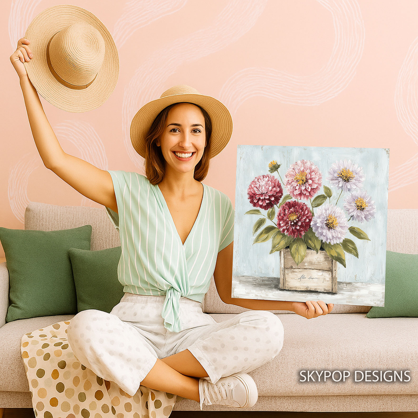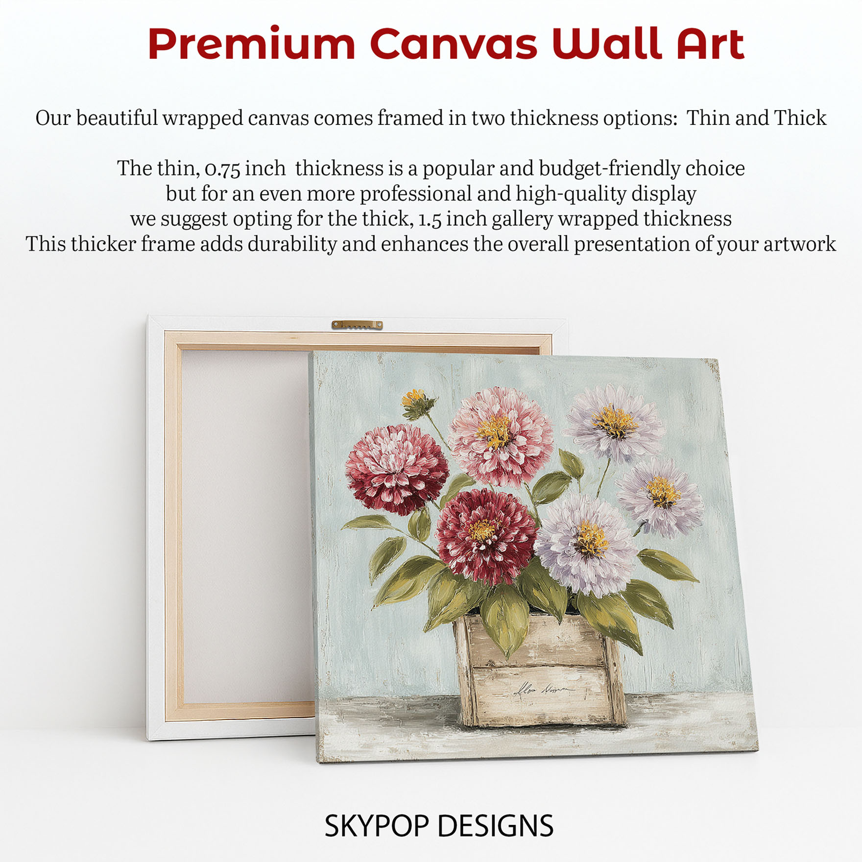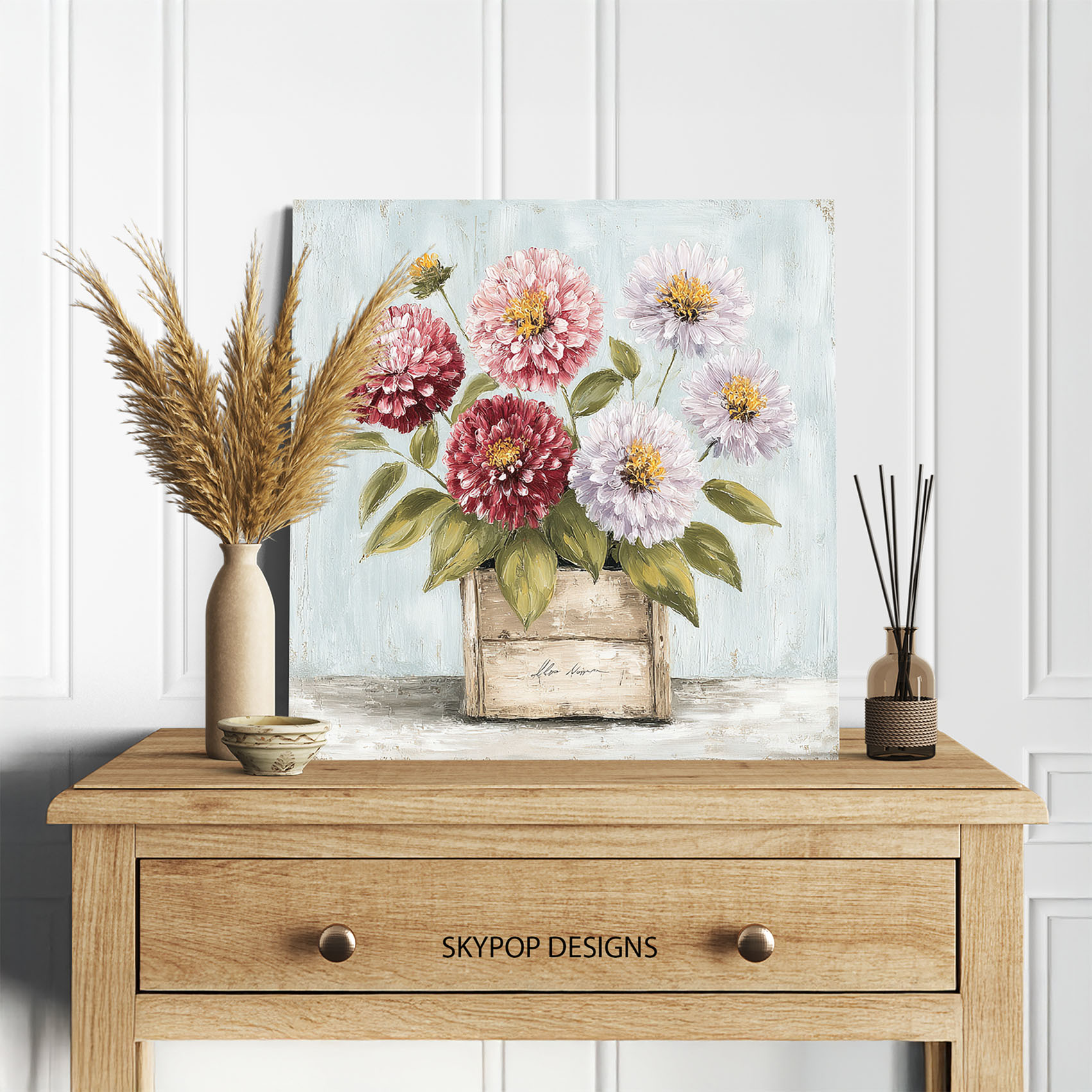 Transform your space with stunning Zinnia canvas wall art that brings the beauty of nature indoors. This captivating poster or canvas wall art showcases vibrant zinnias in a charming wooden crate, perfect for adding a touch of farmhouse charm or rustic elegance to your living room decor. The delicate pink and white blooms, accented by natural green leaves, create a refreshing and uplifting atmosphere. This floral artwork is ideal for creating a cozy and inviting ambiance in your dining room or bedroom. The classic still life style combined with the farmhouse aesthetic makes this piece a versatile addition to various interior styles, including shabby chic. High-quality printing captures the rich textures and painterly details, making this canvas wall art a focal point in any room. Its size versatility allows it to seamlessly fit into hallways or create a focal point above a mantel. This striking floral wall art also makes a perfect housewarming, birthday, or holiday gift for anyone who appreciates timeless beauty. Elevate your home decor with this beautiful Zinnia canvas art that radiates warmth and brings the outdoors in. Celebrate the simple joy of flowers with this heirloom-quality poster or canvas wall art and enhance your wall decor today.