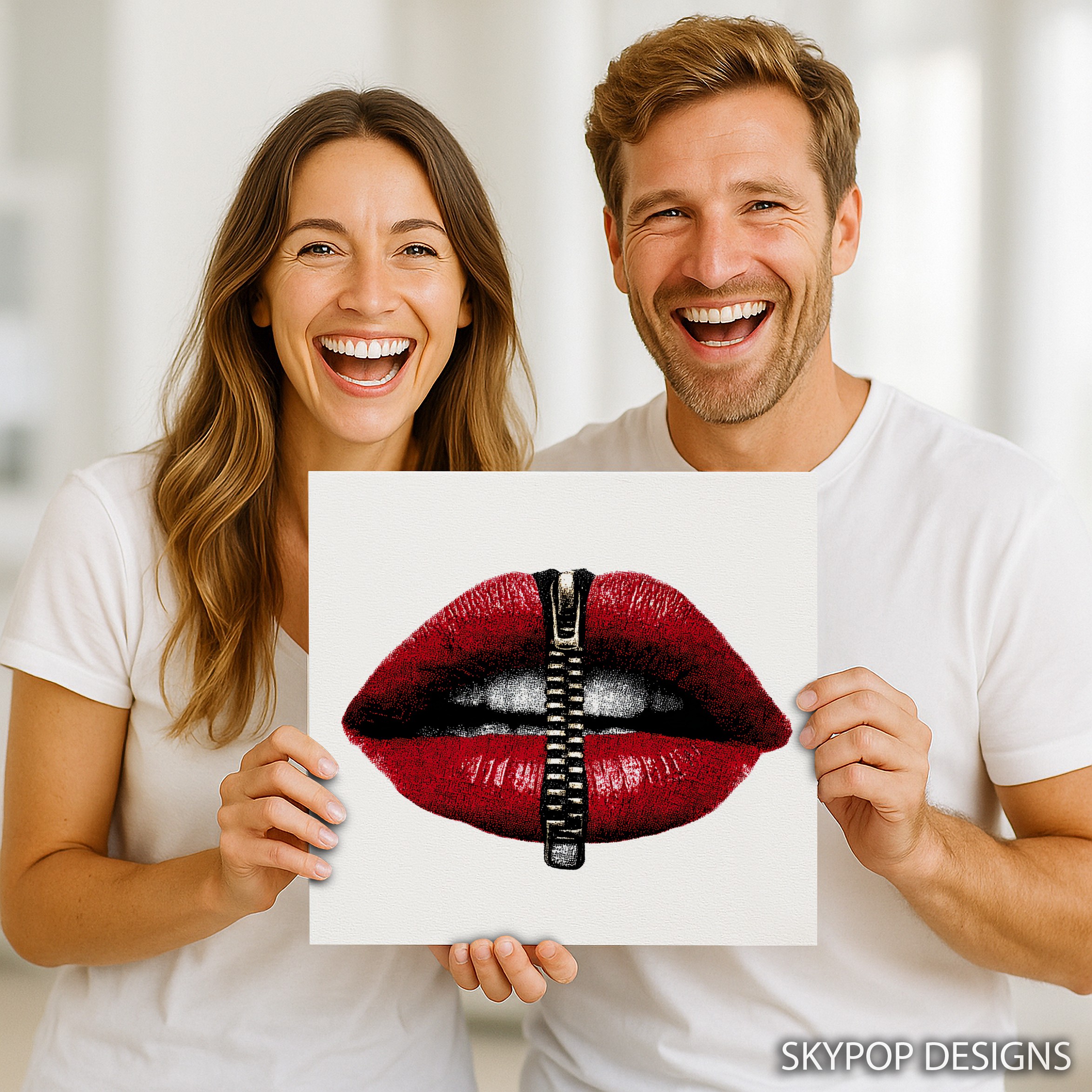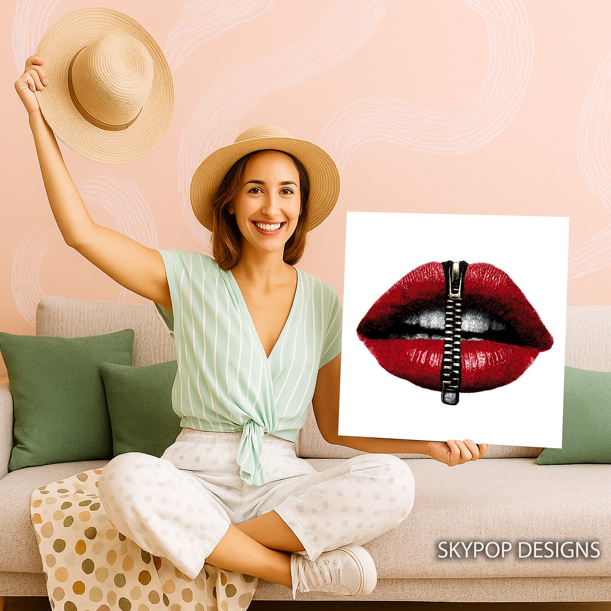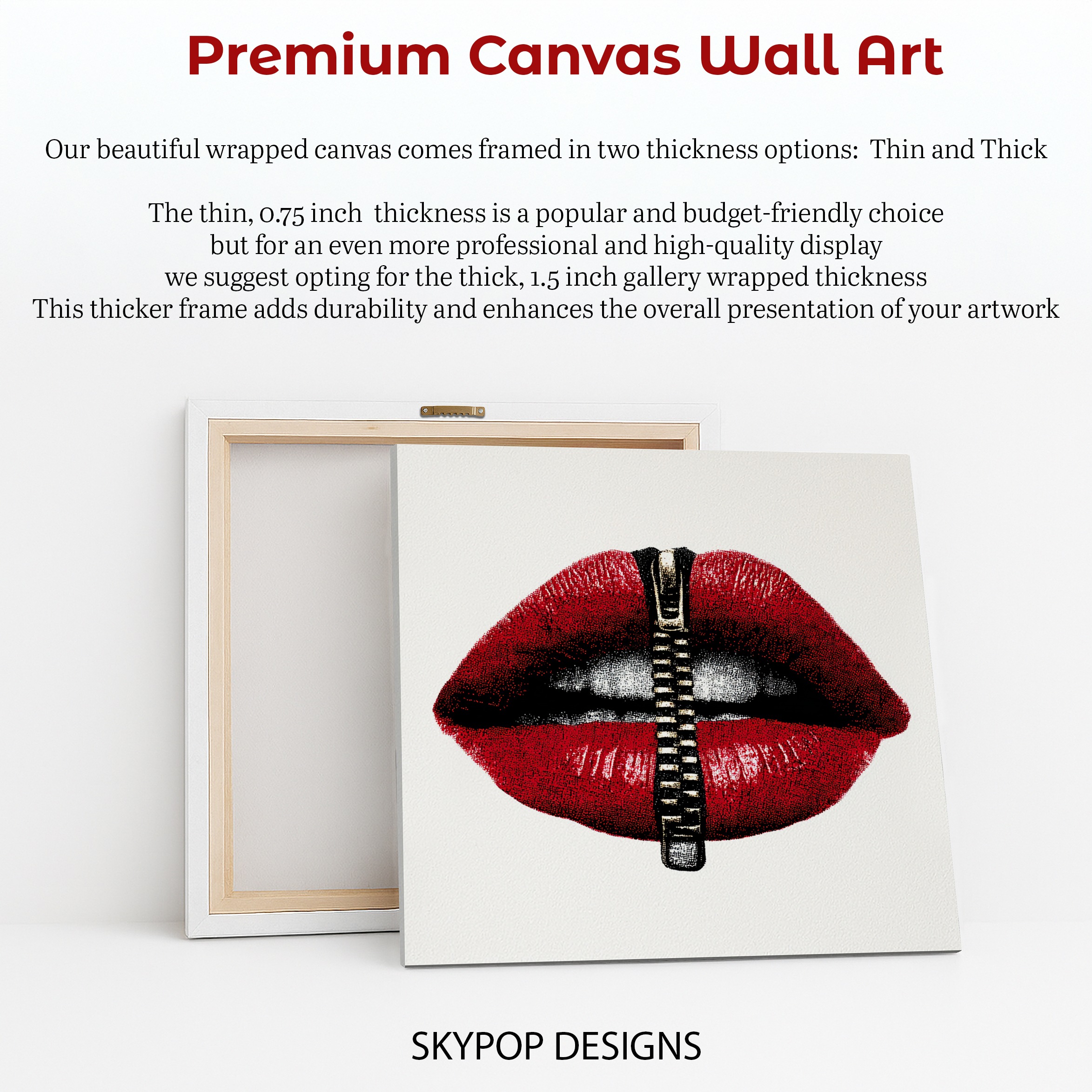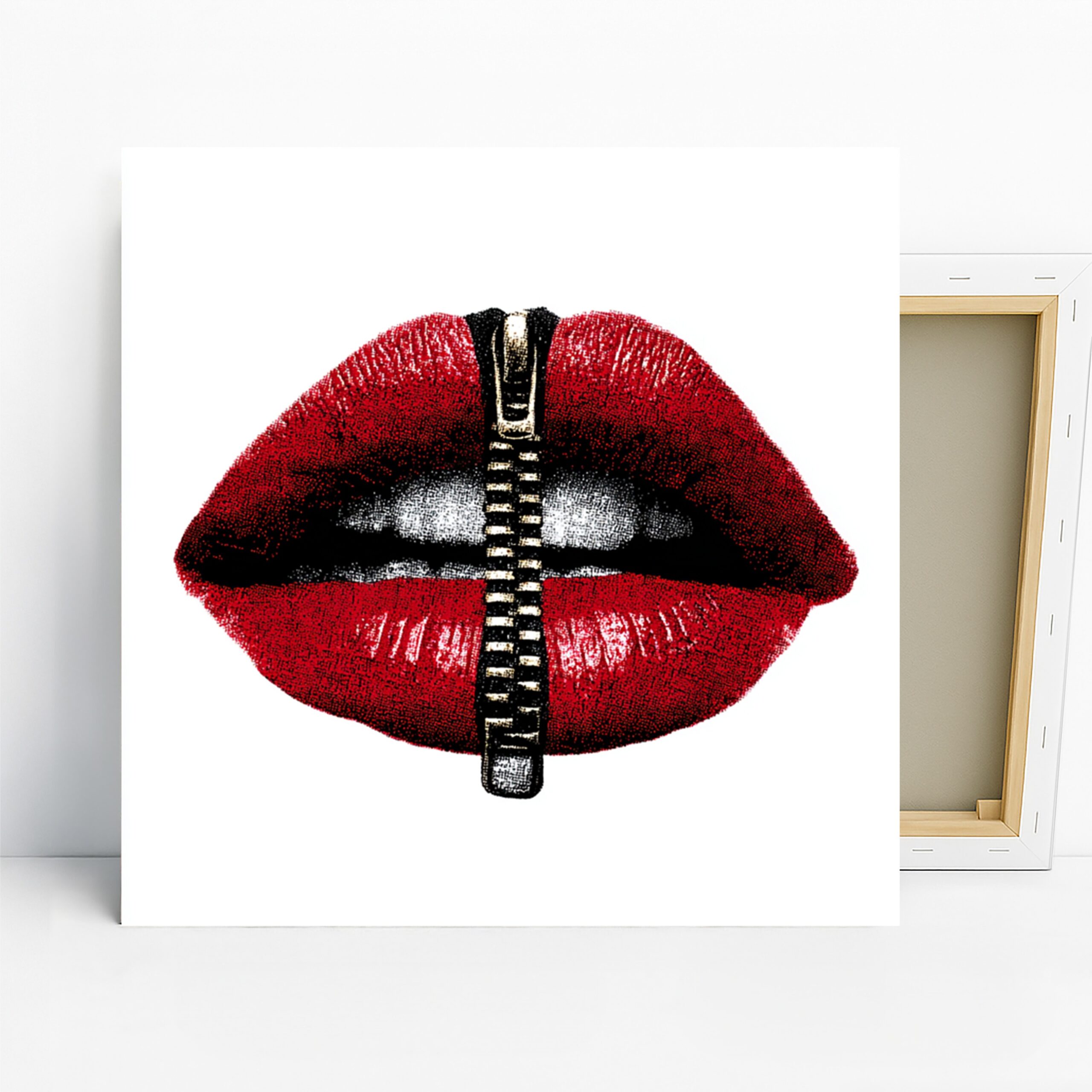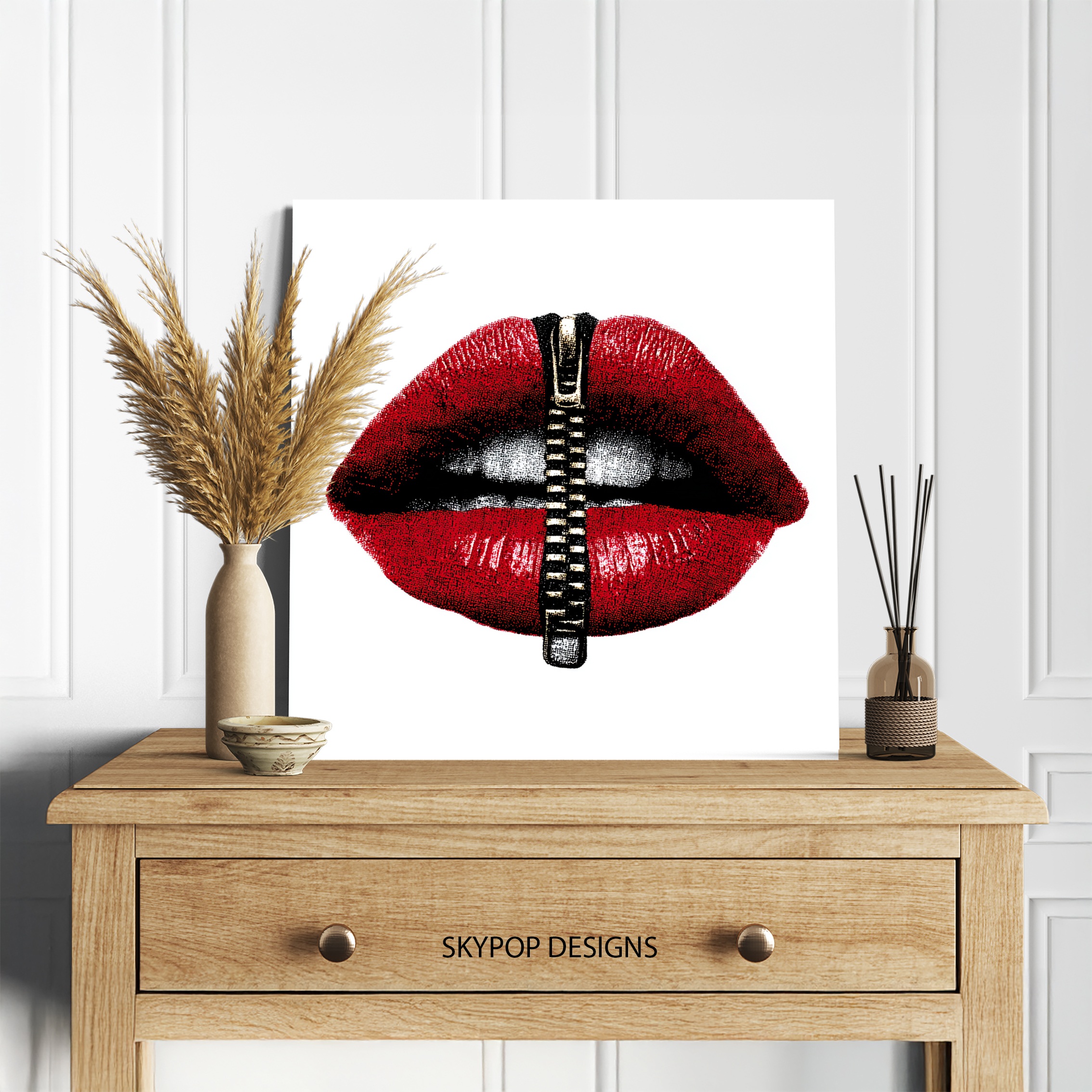 Transform your space with this bold and provocative canvas wall art featuring a striking image of red lips with a zipper closure. This eye-catching poster combines pop art aesthetics with contemporary flair, perfect for adding a touch of glamour to modern interiors. The vibrant red lip print against a stark white background creates a high-contrast look that demands attention, making it an ideal focal point for bedrooms, living rooms, or even bathrooms. The unique zipper detail adds an edgy, thought-provoking element to the classic lip motif, inviting viewers to contemplate themes of silence, secrets, and self-expression. This versatile piece works beautifully in glam-inspired spaces, adding a pop of color and intrigue to minimalist decor schemes. The artwork’s retro influences make it a standout choice for fashion enthusiasts and those who appreciate bold, statement-making decor. Whether you’re looking to spice up a dressing room or create a conversation starter in your living area, this zipped lips canvas art delivers impact and style. The high-quality printing ensures every detail of the lips and zipper is captured with stunning clarity, making it a long-lasting addition to your wall art collection. Elevate your home’s aesthetic with this daring and stylish piece that celebrates the power of visual communication. Make a statement and transform your space today with this unforgettable lip art that’s sure to leave a lasting impression.